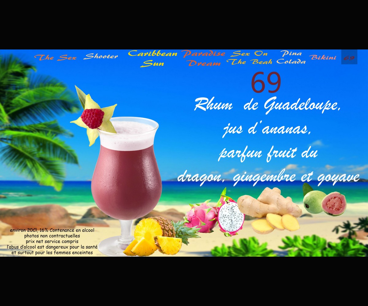 Rhum, ananas, fruit du dragon, gingembre et goyave.