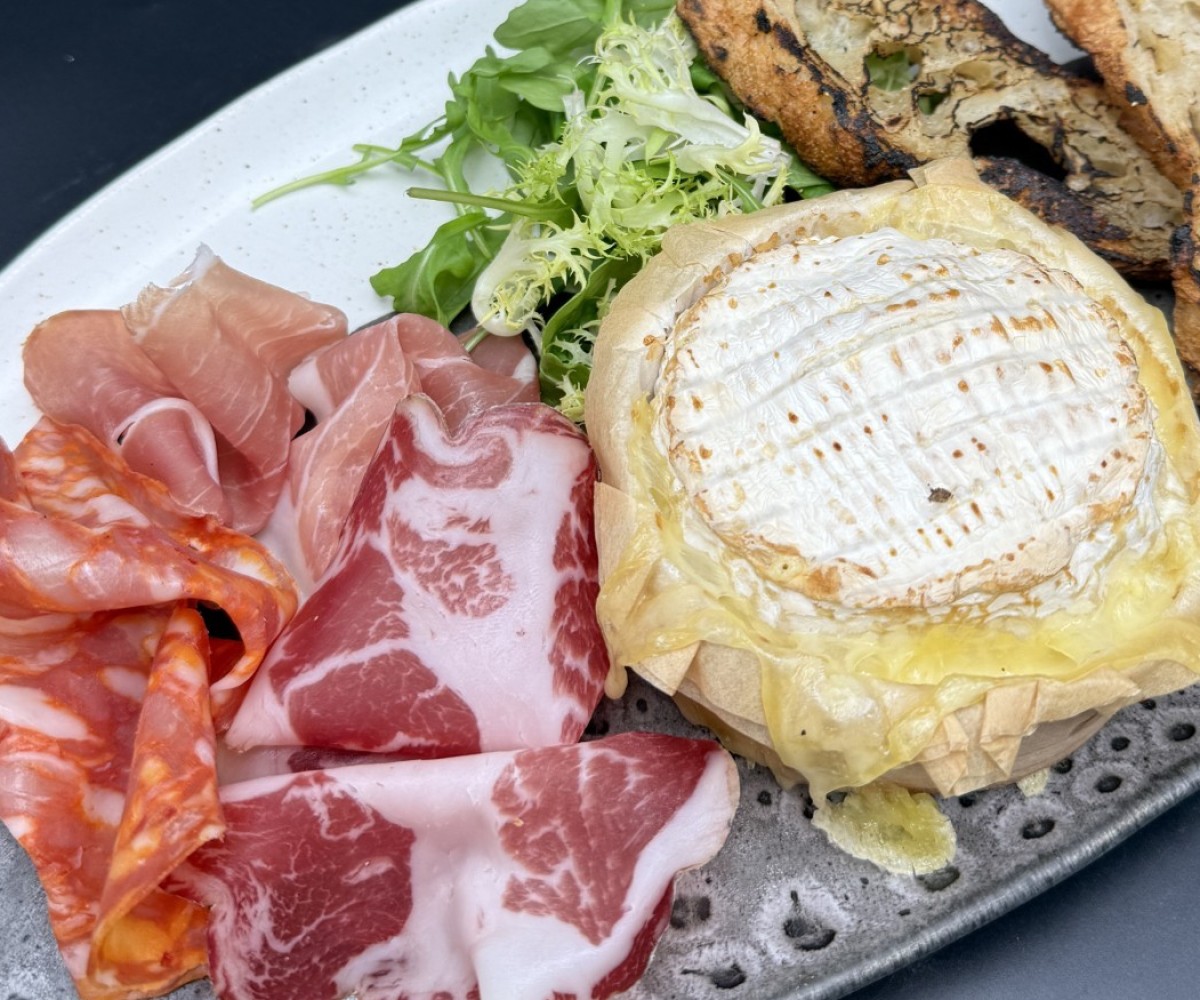 Camembert au four, charcuteries affinées, mâche nantaise et mouillettes de pain grillé