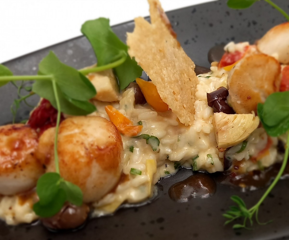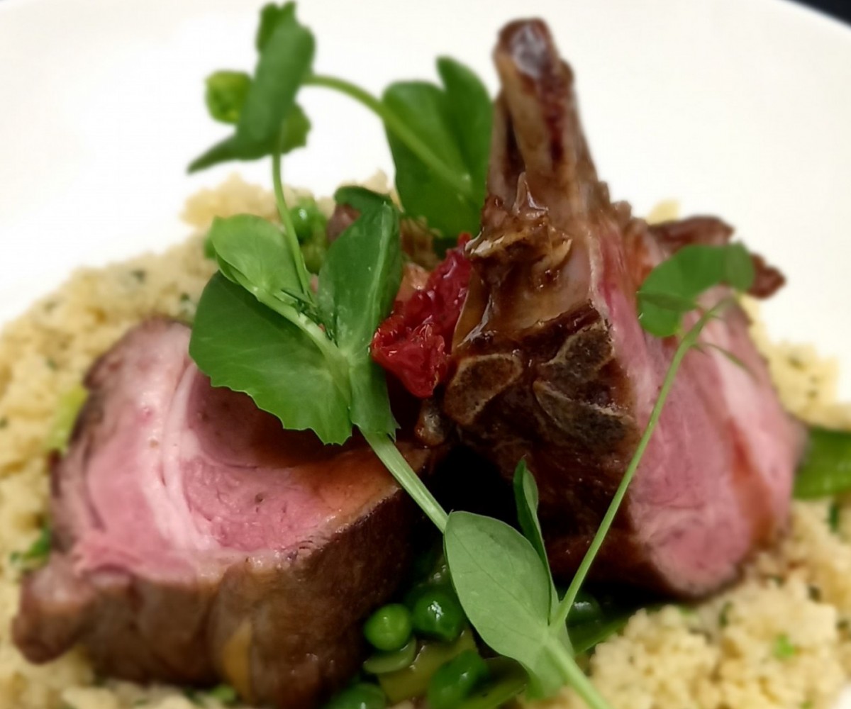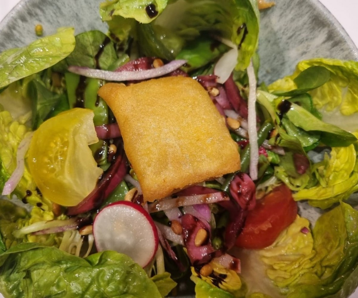 Salade printanière, croustillant au fromage de chèvres, tartare de tomate et pois de saison