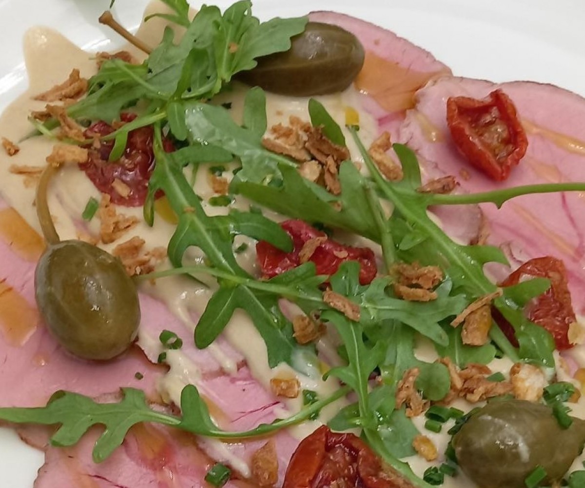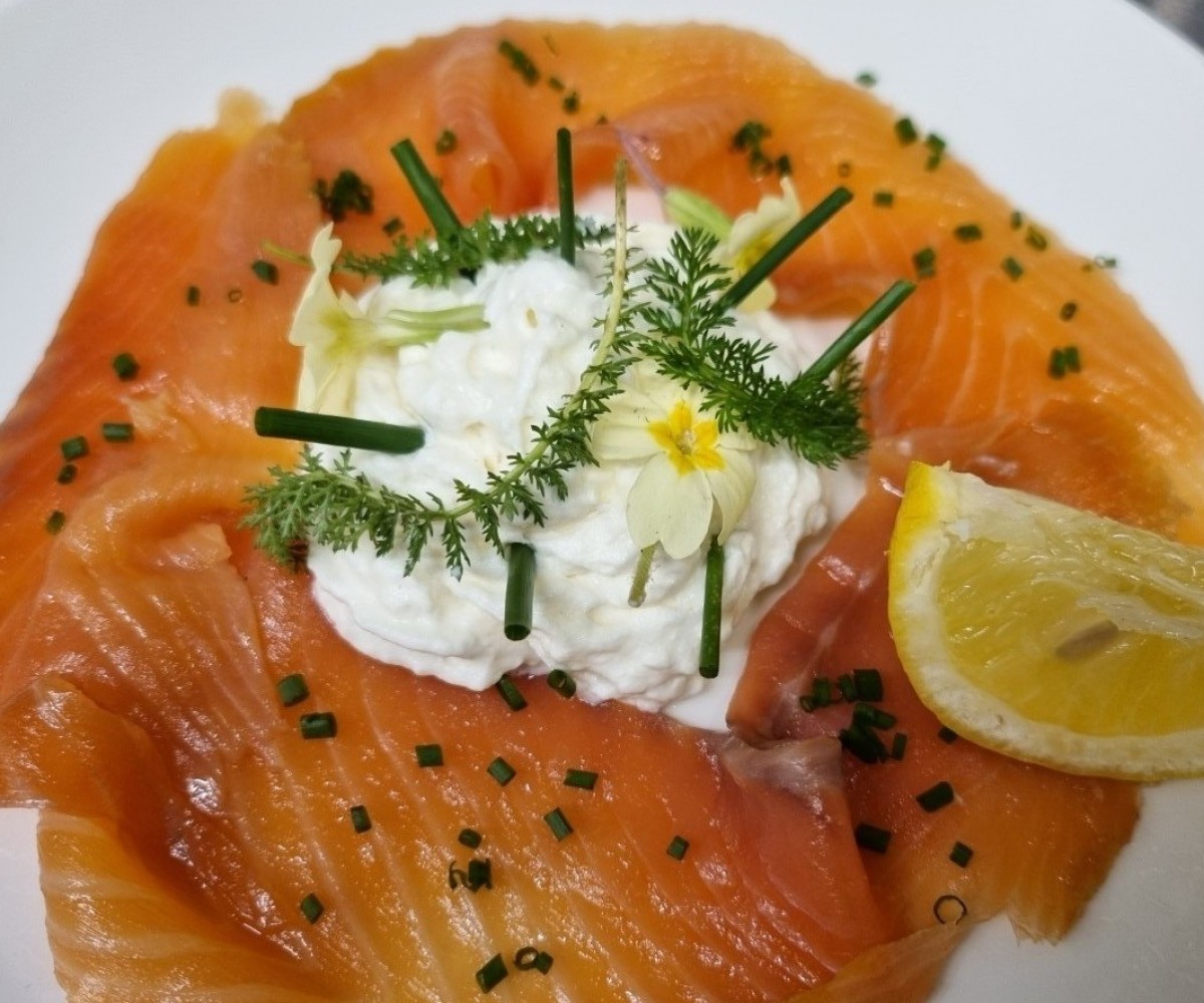 Tranche fine de saumon fumé maison, espuma de fromage et citron confit