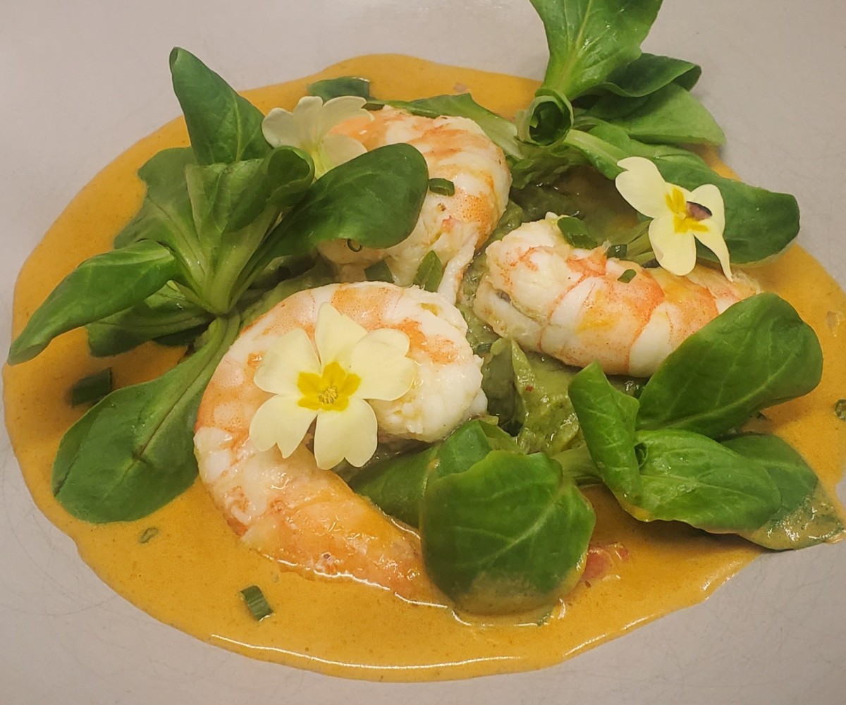 Salade de crevette, guacamole d'avocats, bisque de carotte