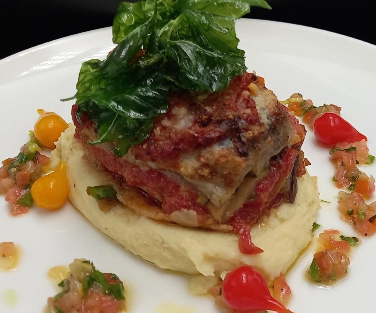 Tranche d'aubergine, courgette, tomate concassées, mozzarella, parmesan, sauce viergePhoto non contracuelle