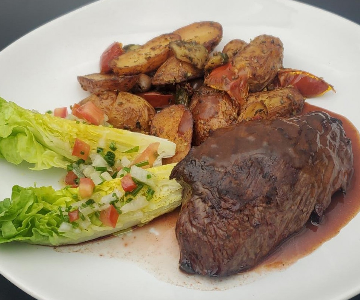 Onglet de boeuf grillé, pommes de terre nouvelle , jus corsé