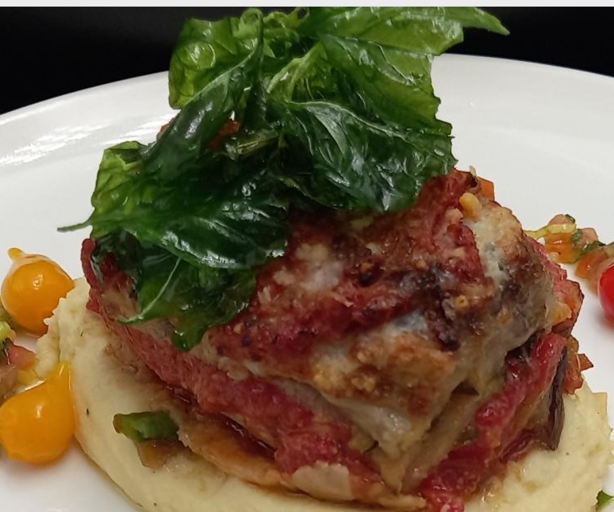 Sliced eggplant, zucchini, chopped tomatoes, mozzarella, parmesan, virgin sauceNon-contractual photo