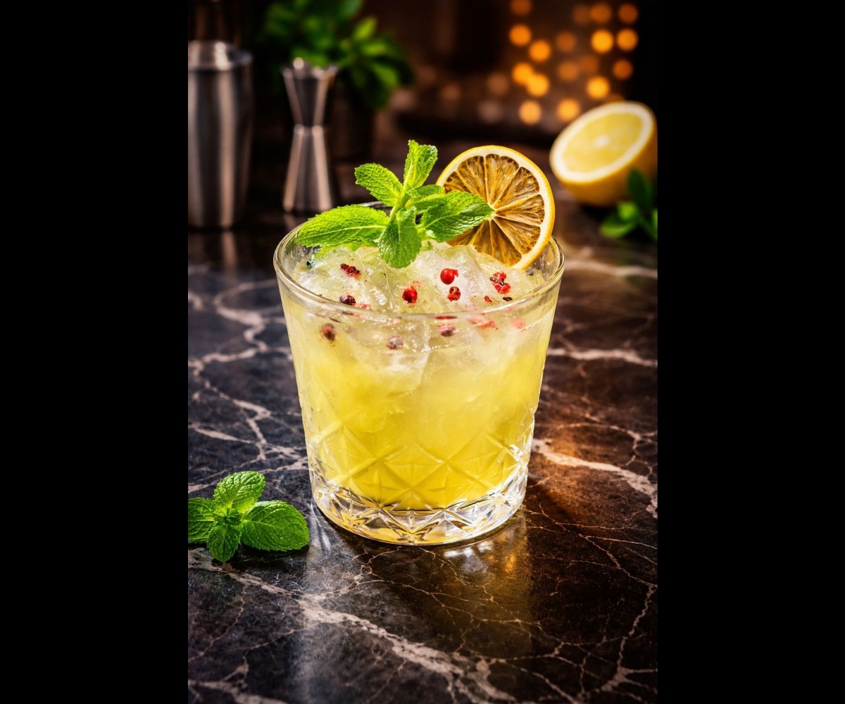 Vodka grey goose almíbar simple, limón, ginger beer,Garnish rodaja de limón y tallo de hierba buena