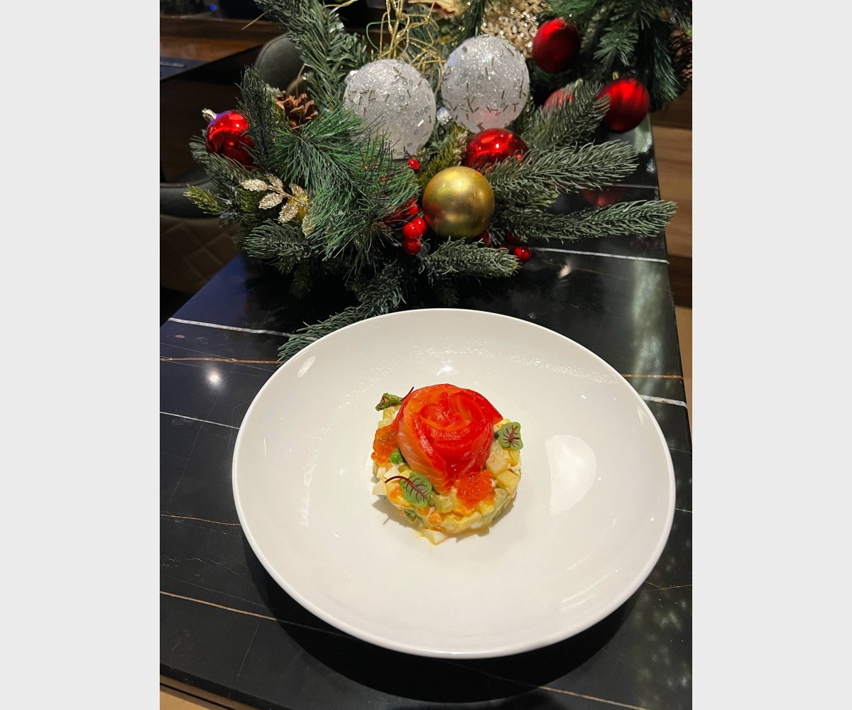 A classic salad in a refined interpretation, featuring tender salmon, select vegetables, and a silky house-made dressing.The taste of tradition in an exquisite presentation.