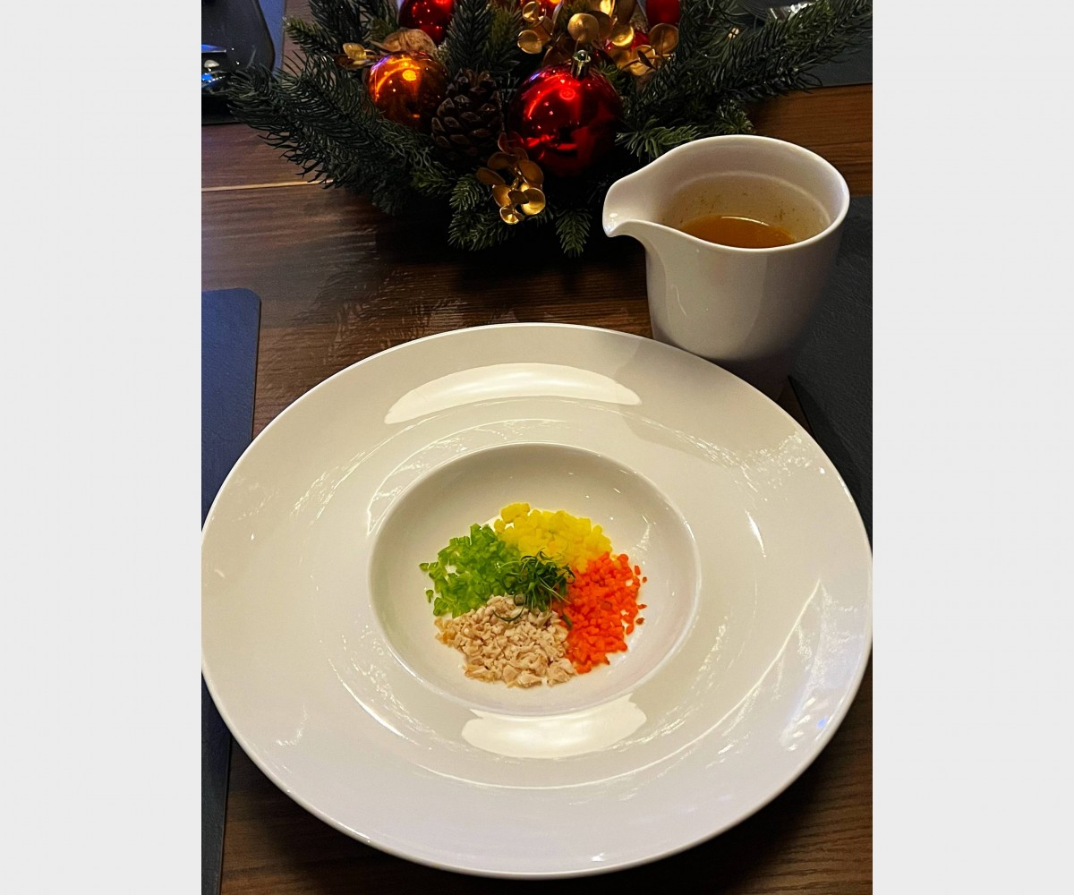 A fragrant clear fish soup made with a rich pike perch and salmon broth, with the addition of salmon roe. Clean, deep flavor with a noble accent.TOSSED AND MINGLED