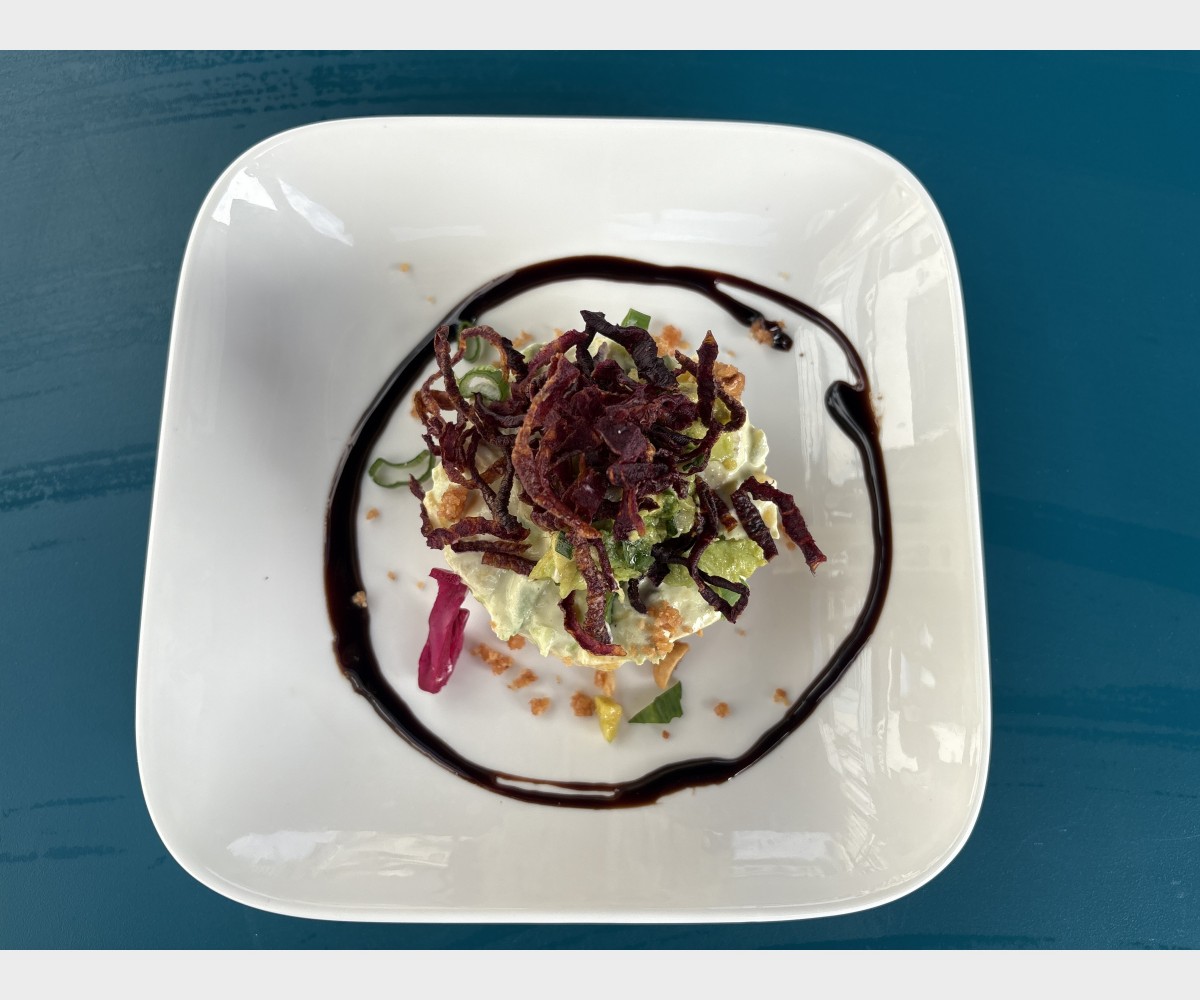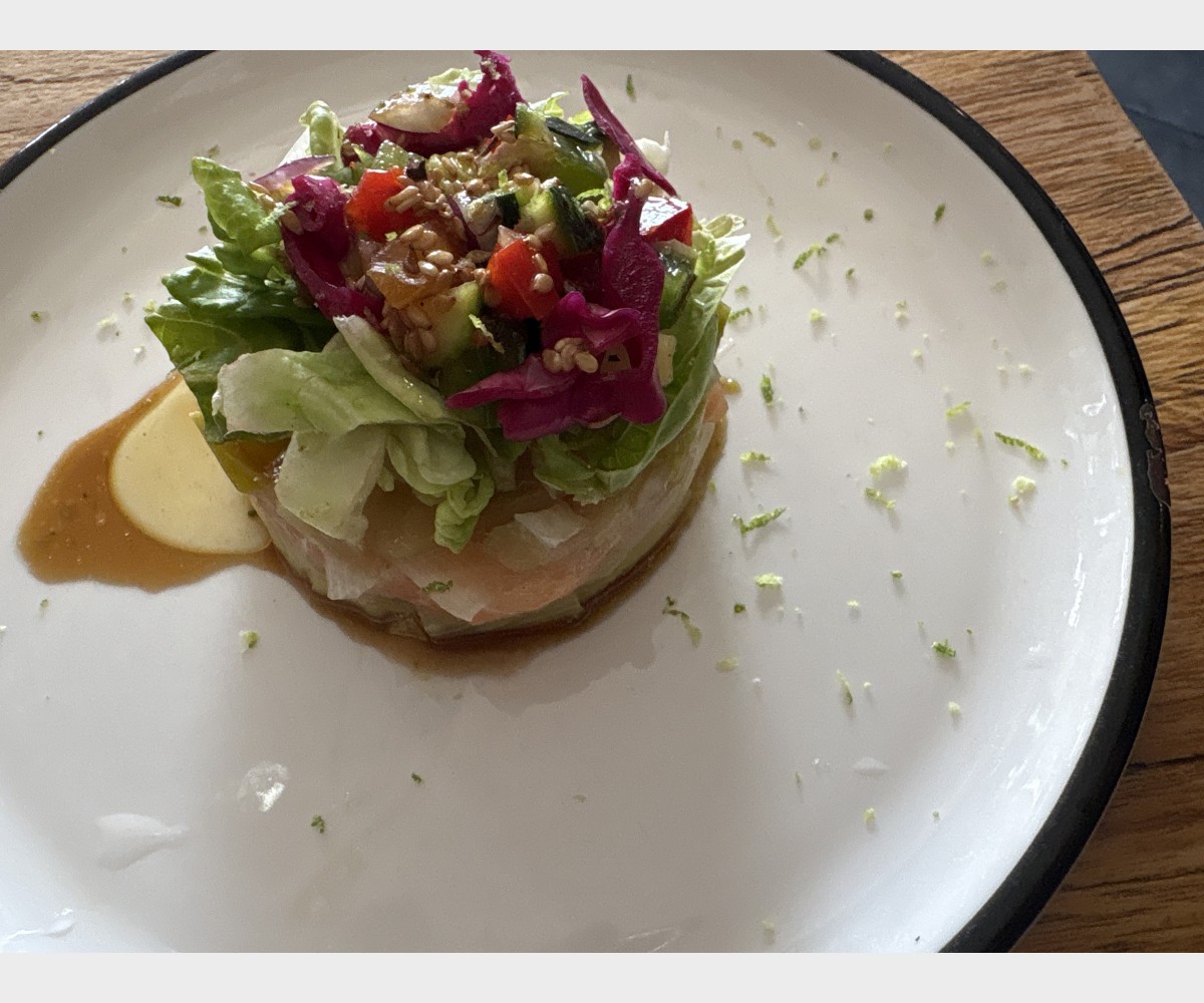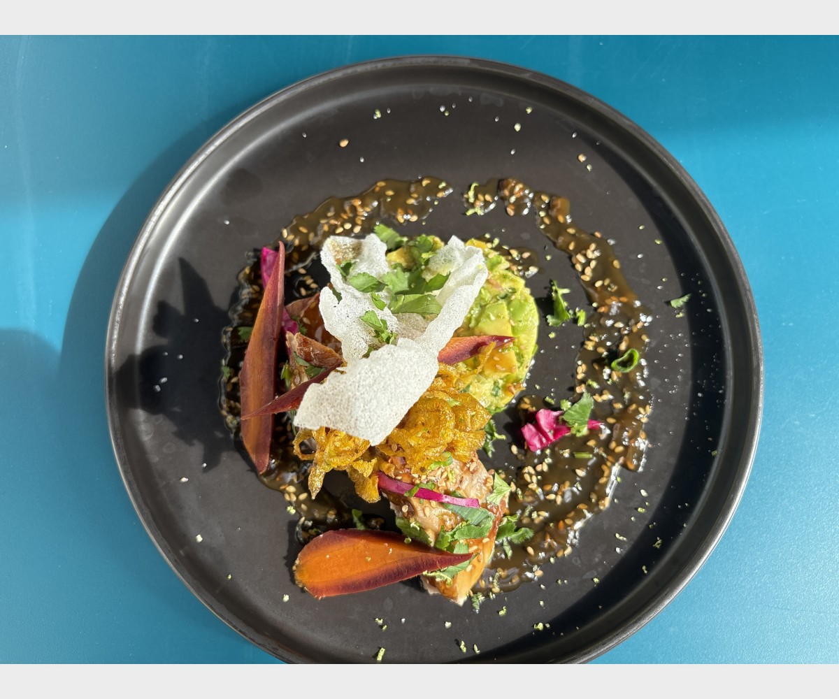 Tataki de thon , chips de feuilles de riz, tartare d’avocat, Jus de sésame, soja, coriandre et son risotto