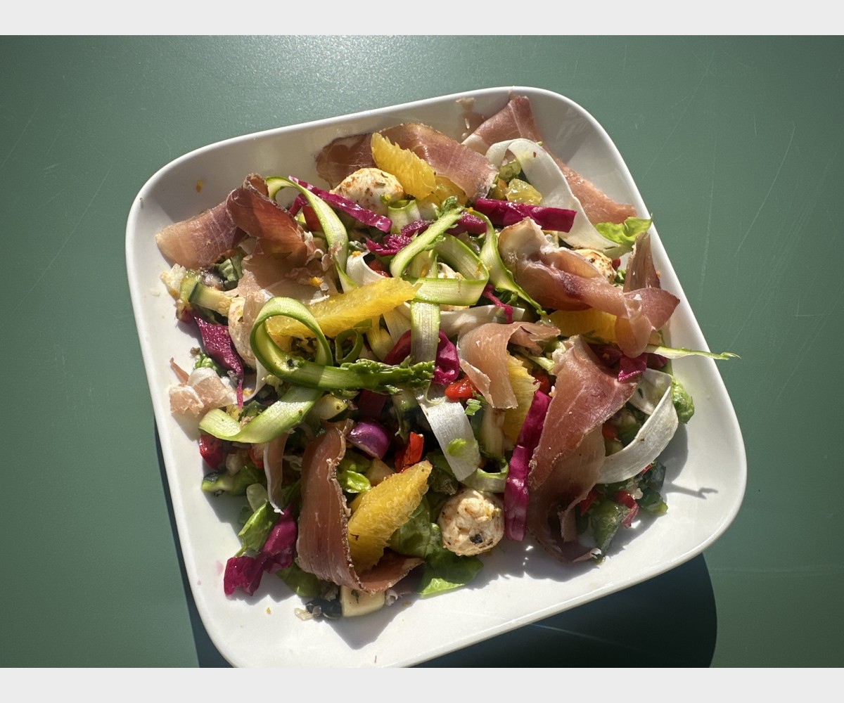 Salade d’asperges en tagliatelles, jambon cru , billes de mozzarella, condiments olives ,oranges et câpres