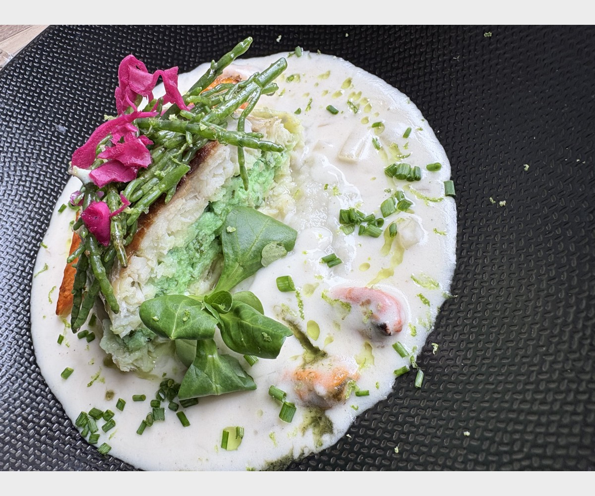 Dos de lieu farci aux herbes, crème marinière, mousseline de fenouil, risotto de Mamie Natia