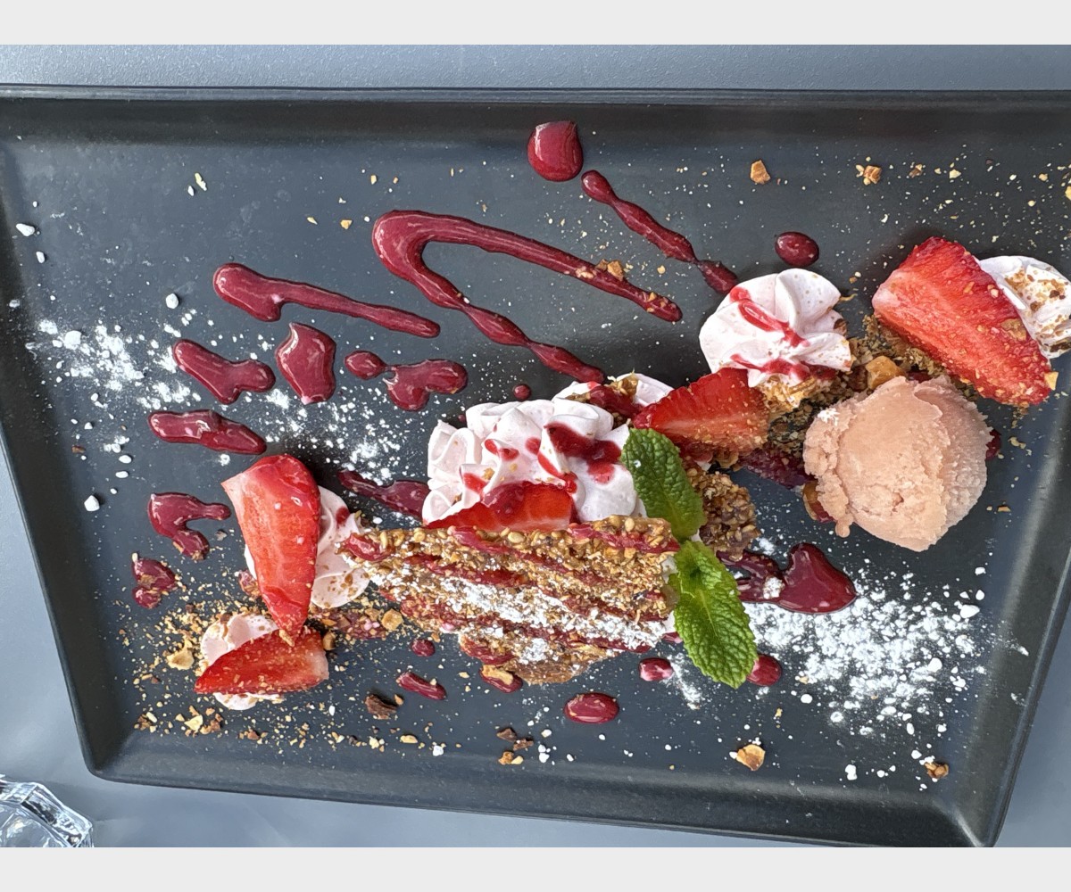 Nougatine de sésame, Crémeux de fraises, glace rhubarbe