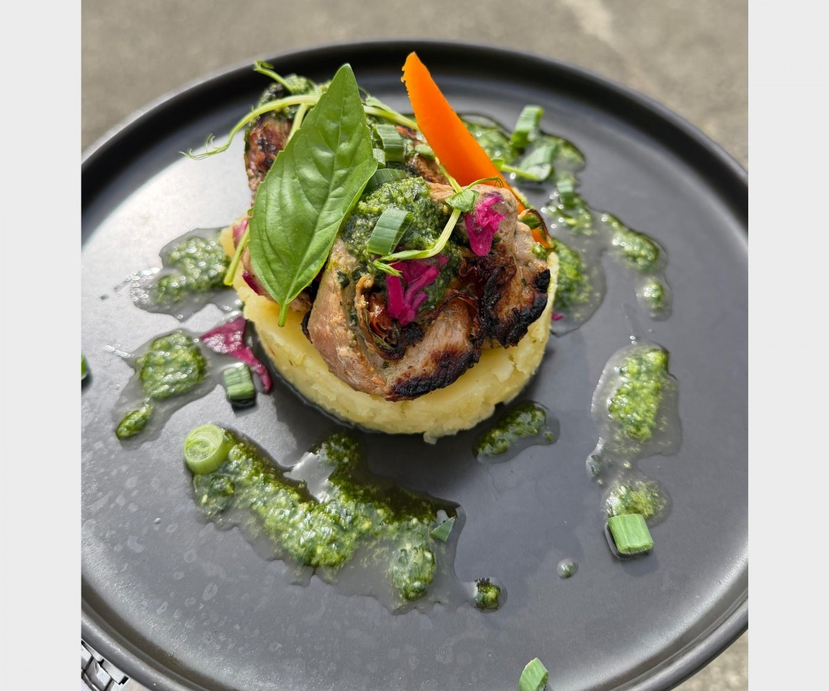 Filet mignon à l’Italienne (basilic, jambon, pignons de pins ) jus pesto et mousseline de pomme de terre