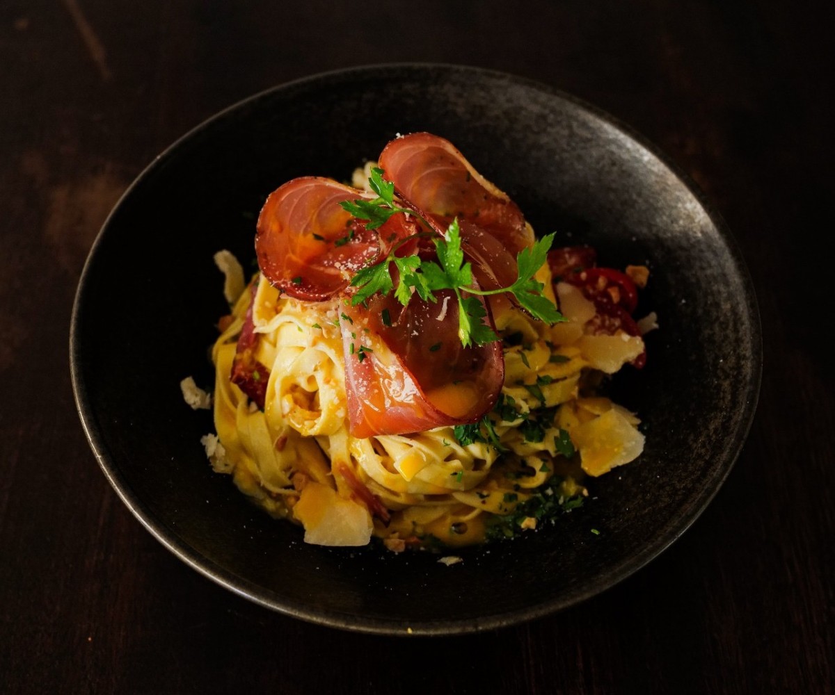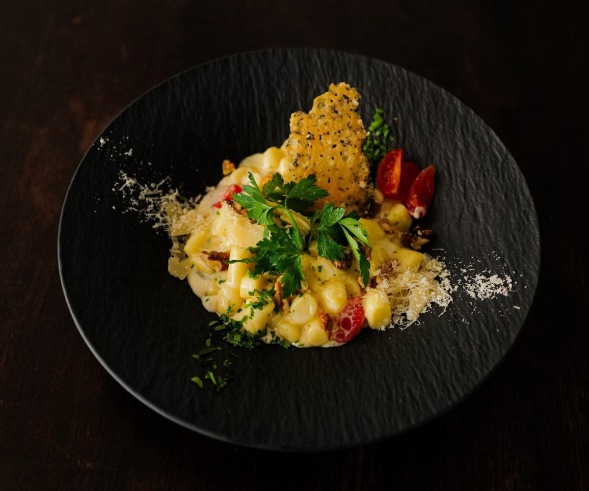 Speck, oignons confits, tomates séchées, noisettes, jaune d’œuf, crème, parmesanGnocchi Fatti Casa