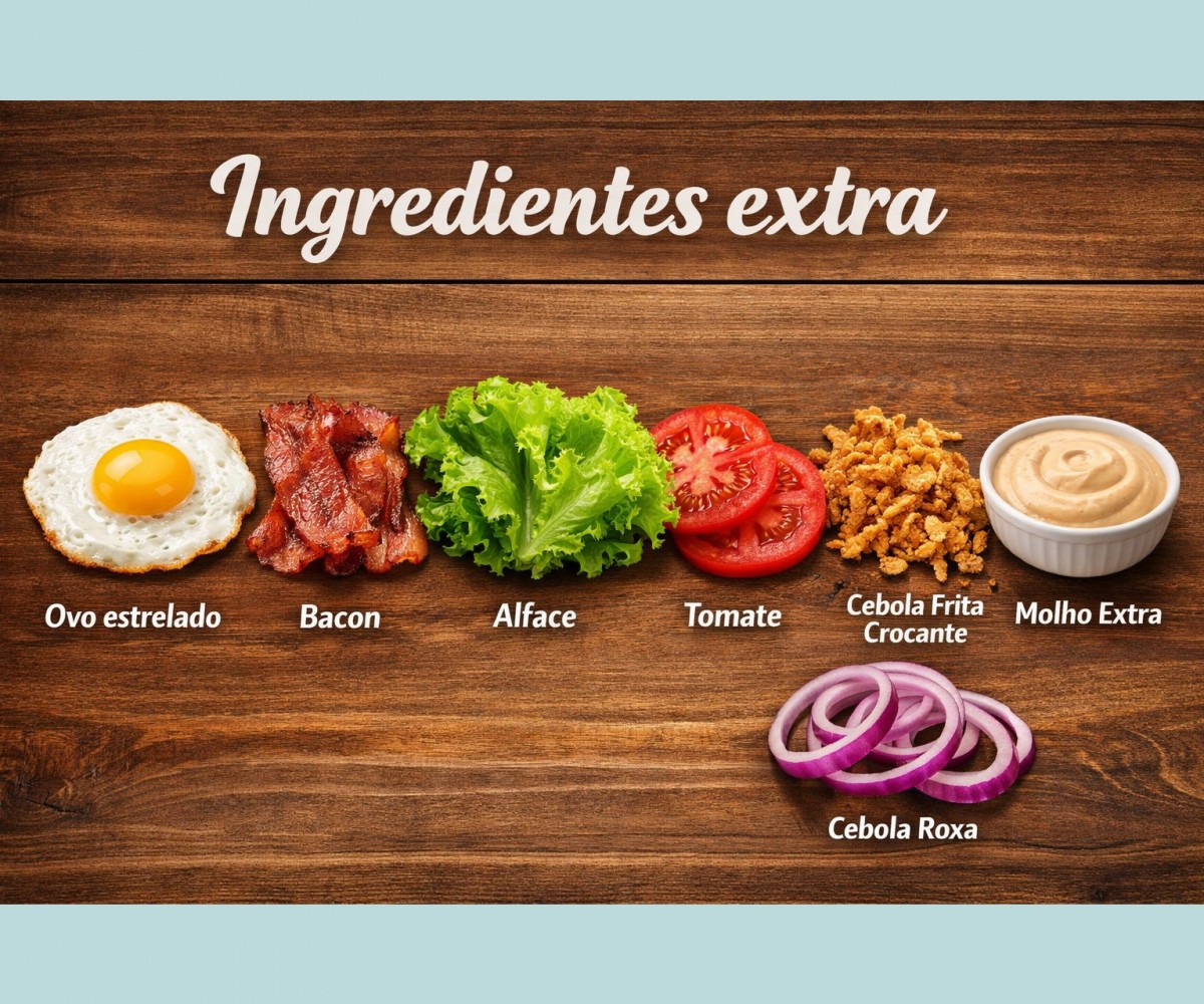 Pão de hamburger, 150 Gr de carne 100% vaca, ovo estrelado, alface, tomate, cebola roxa fresca, molho especial de hamburger.
