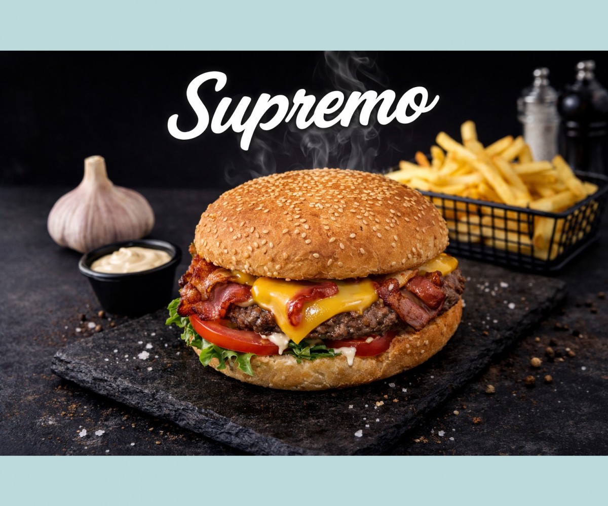 Pão de hambúrguer, 150 Gr de carne 100% vaca, bacon, queijo, alface, tomate, molho de alho.