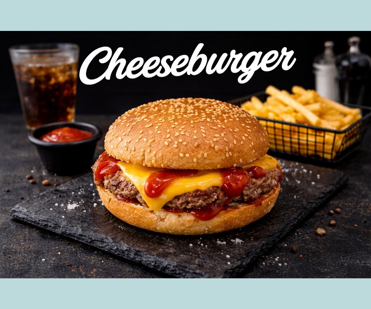 Pão de hamburger, 150 Gr de carne 100% vaca, queijo cheddar e ketchup.