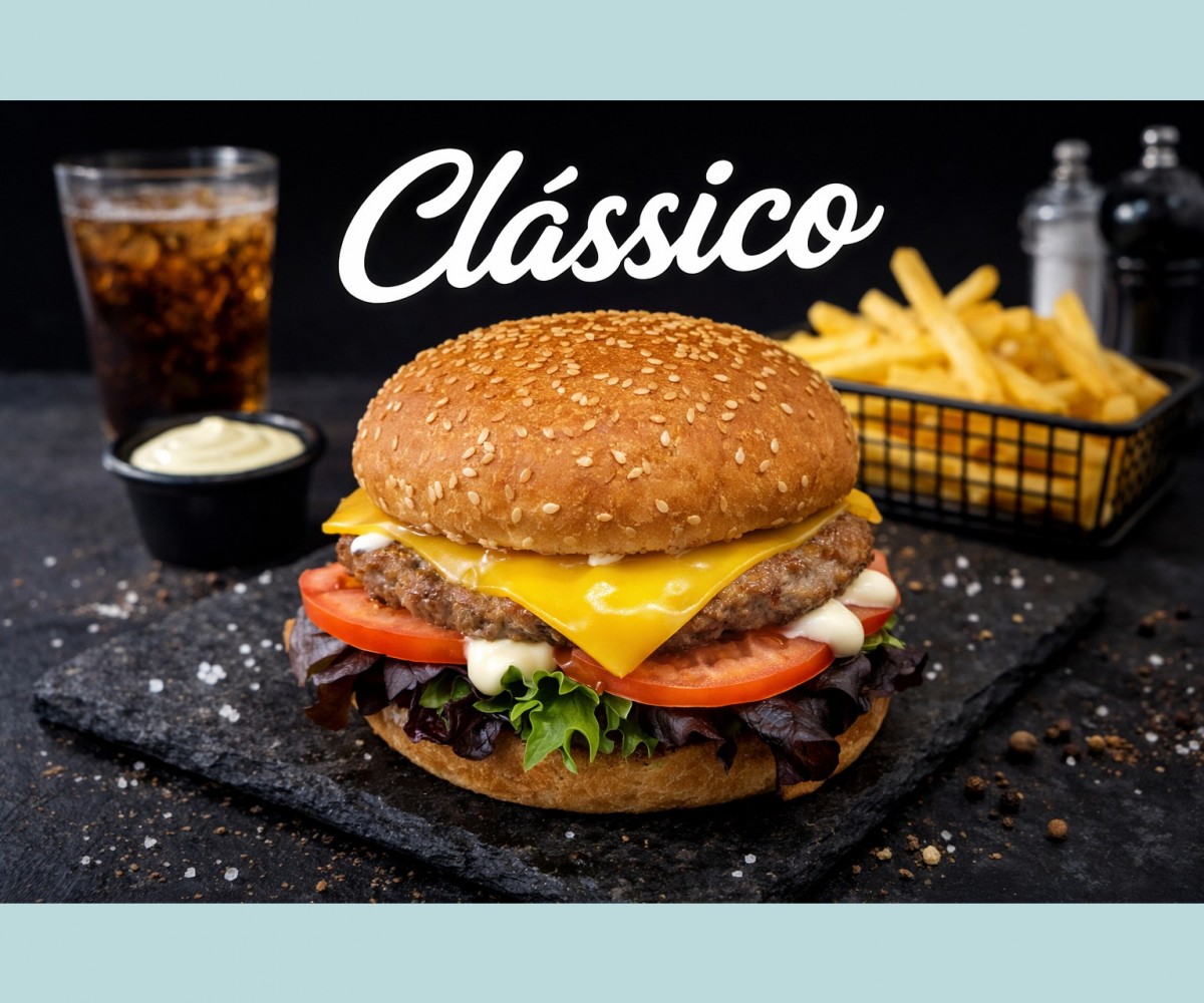 Pão de hamburger, 150 Gr de carne 100% vaca, alface, tomate, queijo cheddar, mayonese.