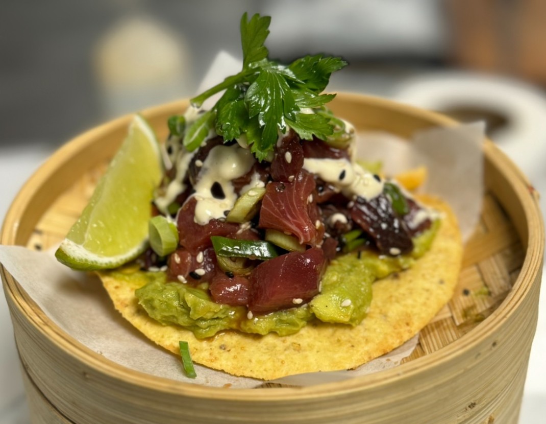 Tataki de Canard façon Nikkei (Cuisine Fusion Japonaise-Péruviennes). sauce yuzu, grenade, mangue, échalotes, piment vert, coriandre accompagné de ses frites maisonsGARNITURES