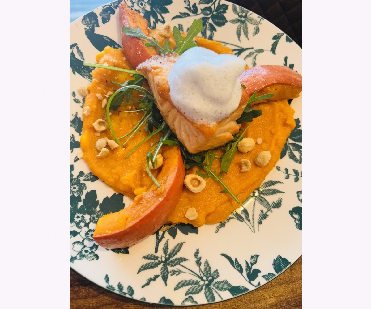 Pavé de saumon potimarron en 2 façon et san purée avec pommes de terre, noisette 'émulsion vanille