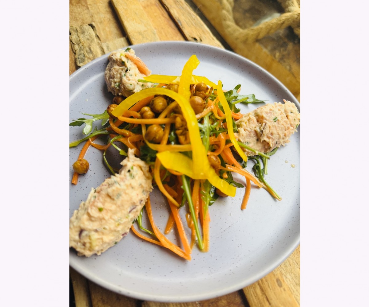 Rillette au deux saumons, écrevisses, pois chiches croustillant er carttes ciboulette
