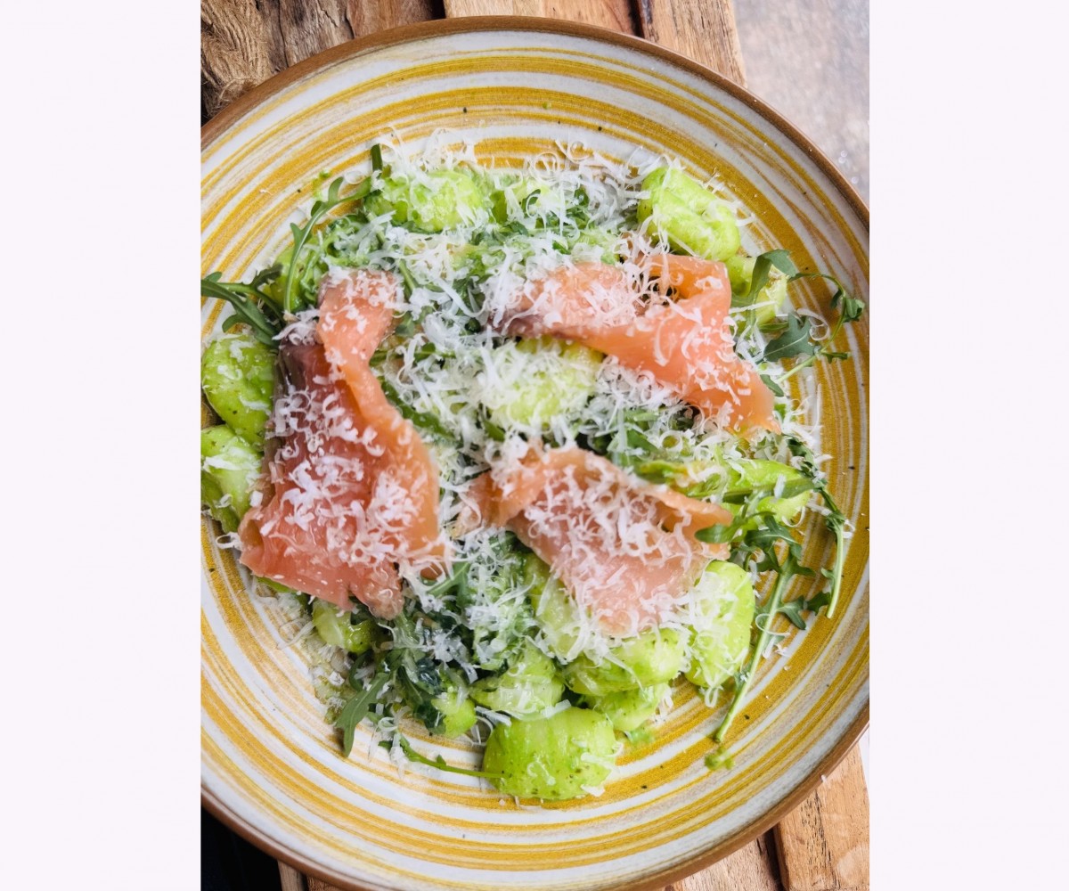 Salade de gésiers de canard, figues moelleuses, petit croûtons, ail et persil, magret fumée maison, pickles de légumes.