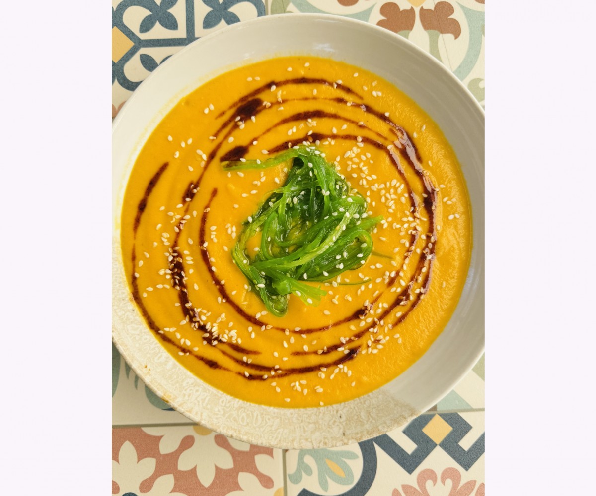 Velouté carottes bio, lait de coco algues wakamé sésame et caramel d'épices