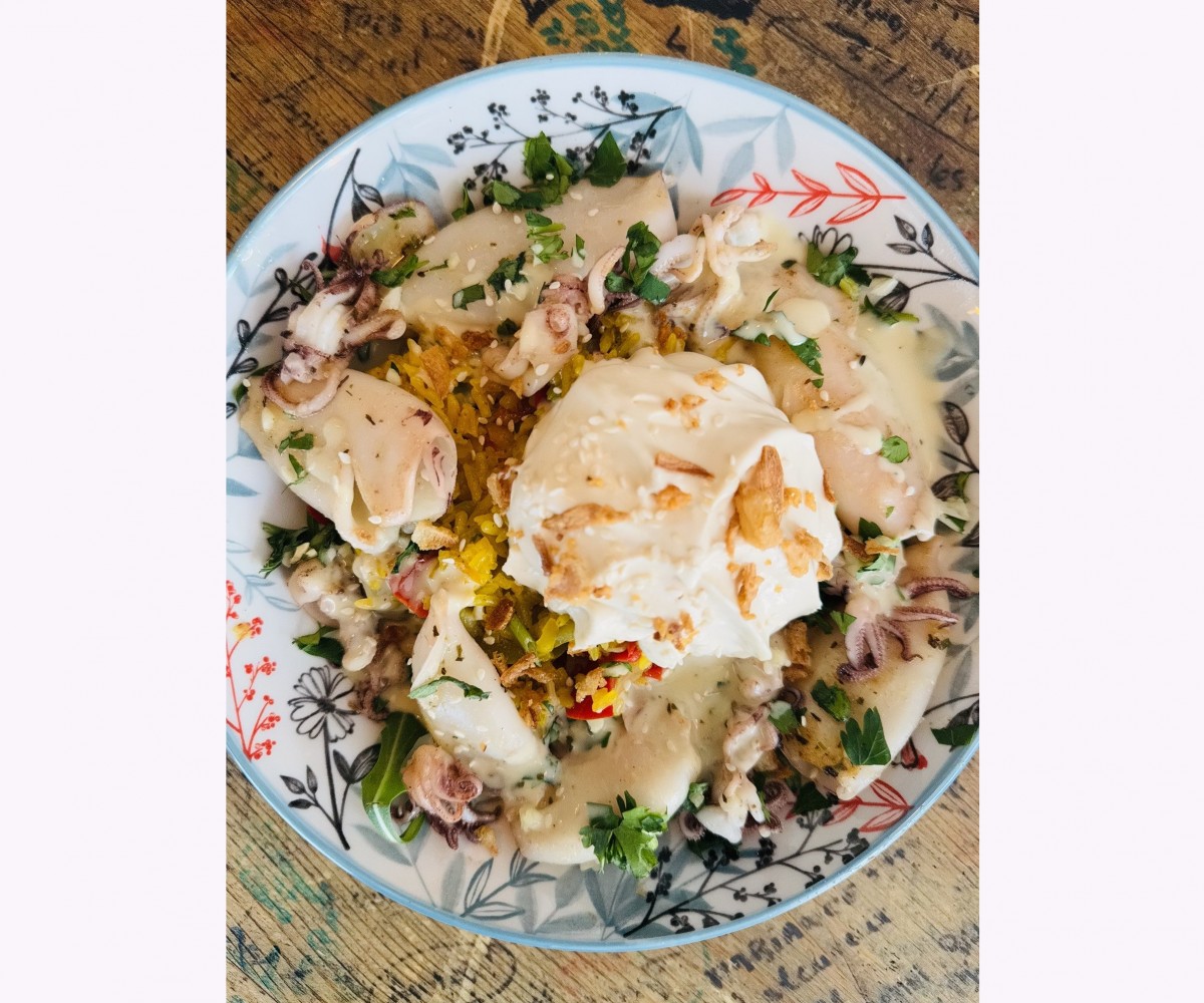 Chipirons santé croquette ibérique, chantilly ibérique,riz parfumé et légumes