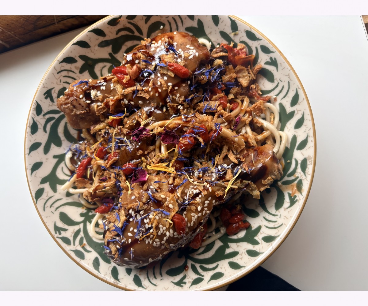 Poulet thaï aux baies de goji, nouilles sautées citronnelle et gingembre sésame