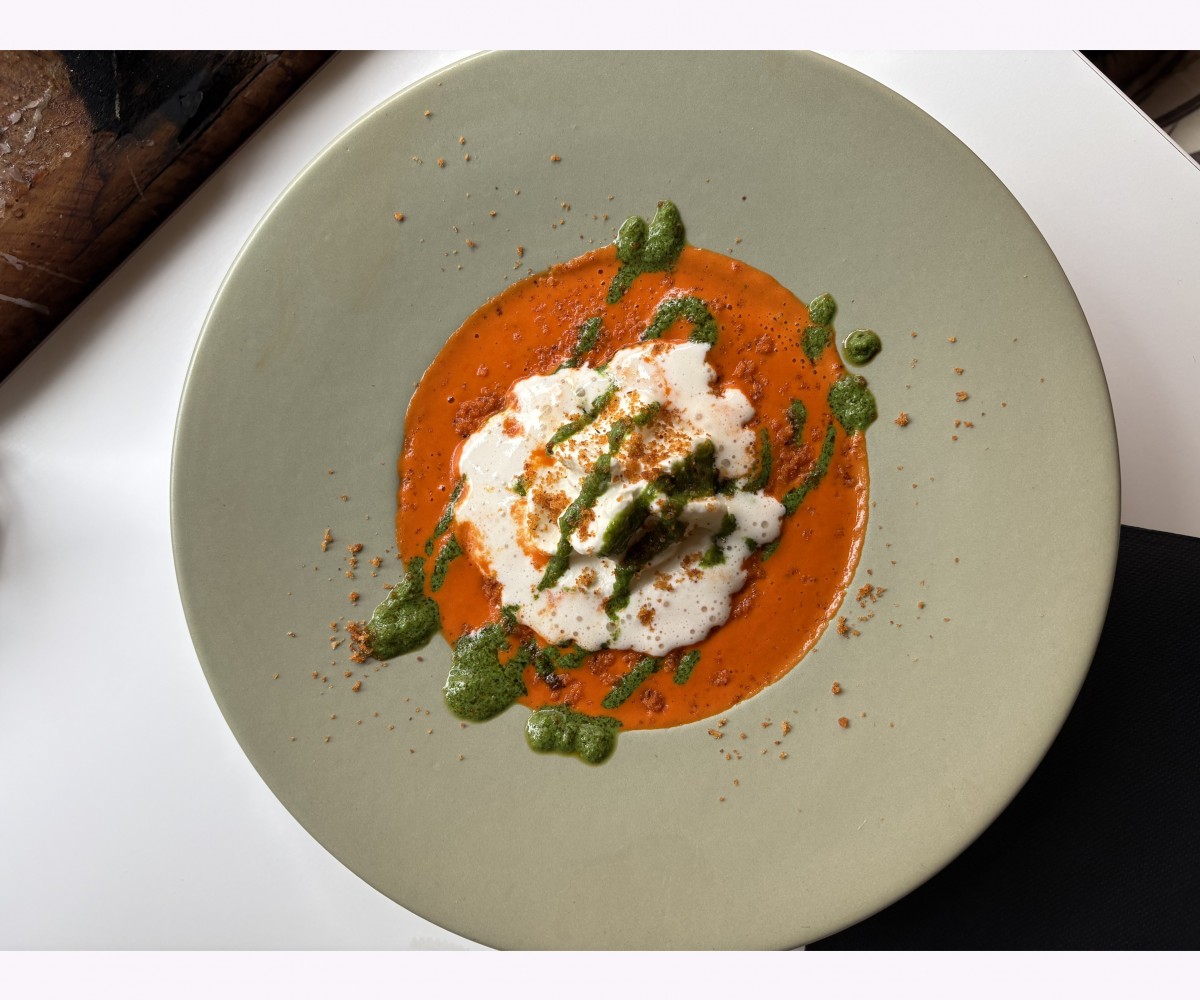 Brioche perdu au pesto Burrata, pistache, cajous, et confiture de tomates séché.