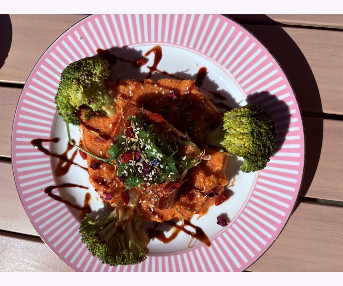 Pavé de saumon grillé, purée de carottes citronnelle et gingembre, brocolis, wakamé et sésame