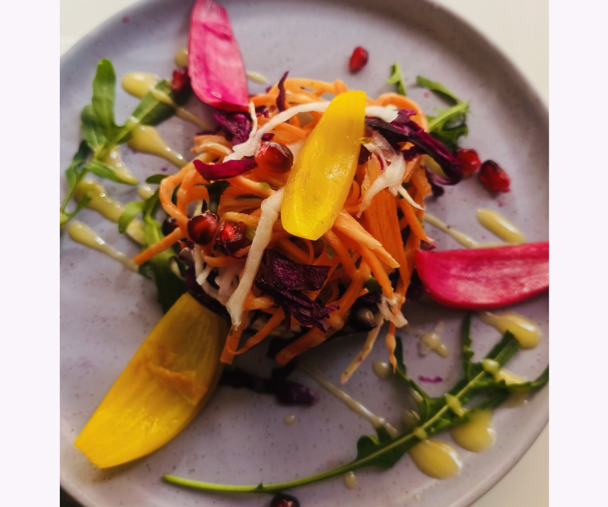 Assiette de crudités: carottes, céleri-rave, choux rouge et blanc, grenade
