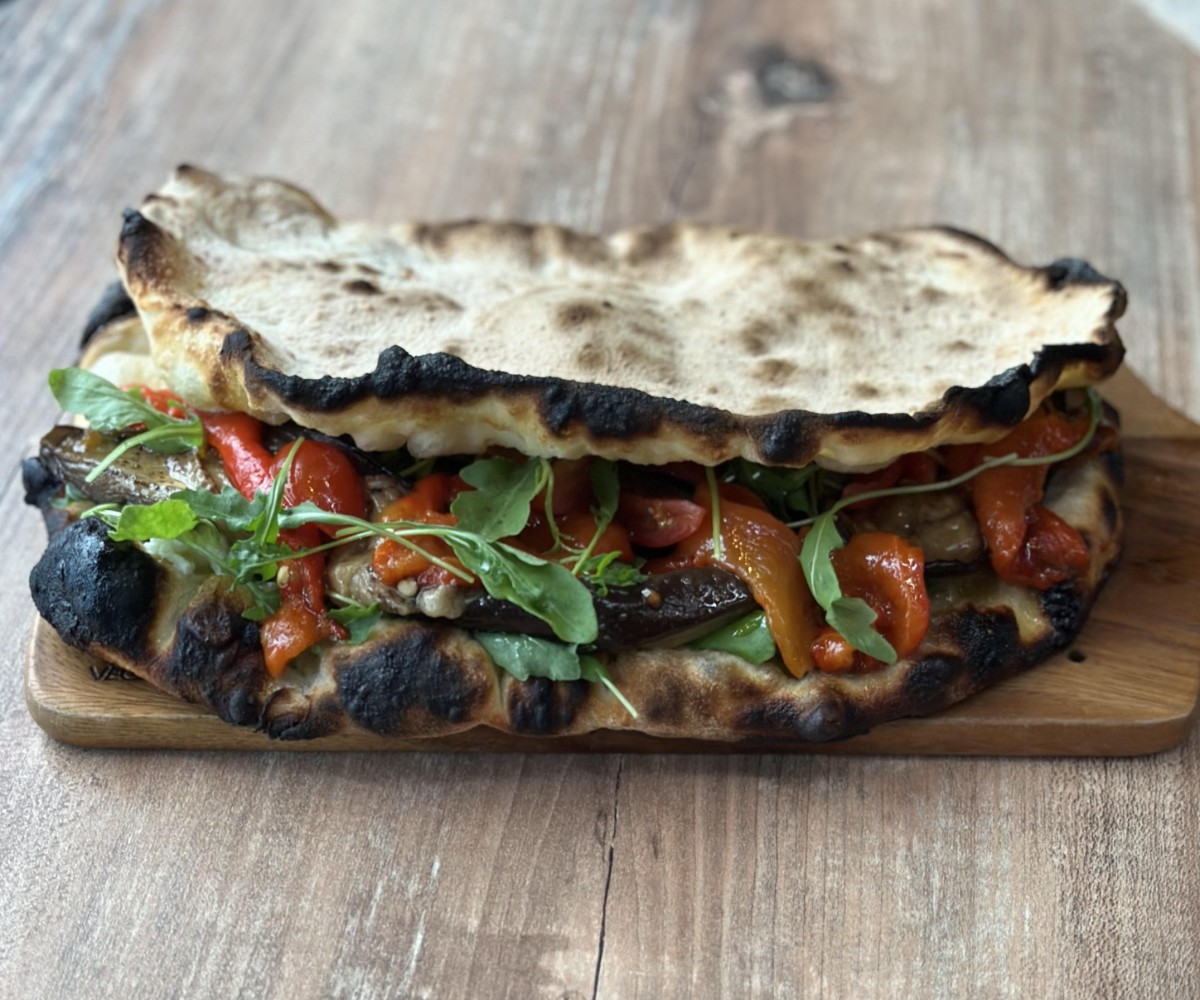 Italian tomato base, zucchini, grilled eggplant and peppers, fresh from the oven: arugula, cherry tomatoes