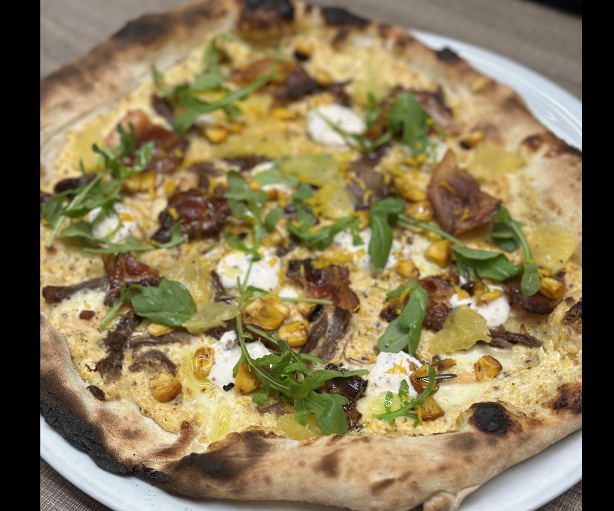 Effiloché de canard sur crème de panais, ricotta agrumée, mozzarella, tomates cerise, zeste d'orange, maïs rôti, poivre noir du Lampong, pointe de roquette