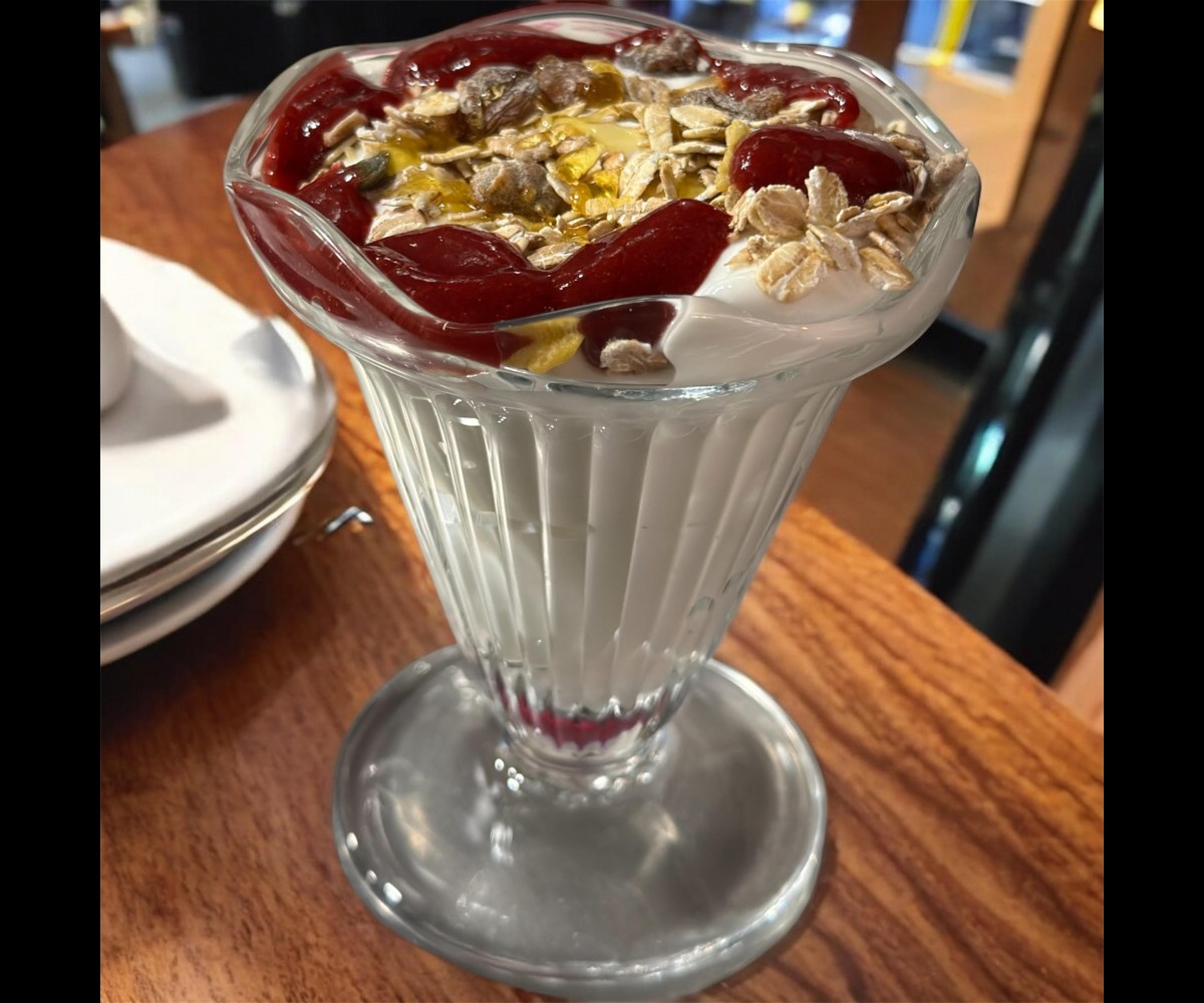 Au muesli de figues, abricots, raisin et coulis de fraise maison