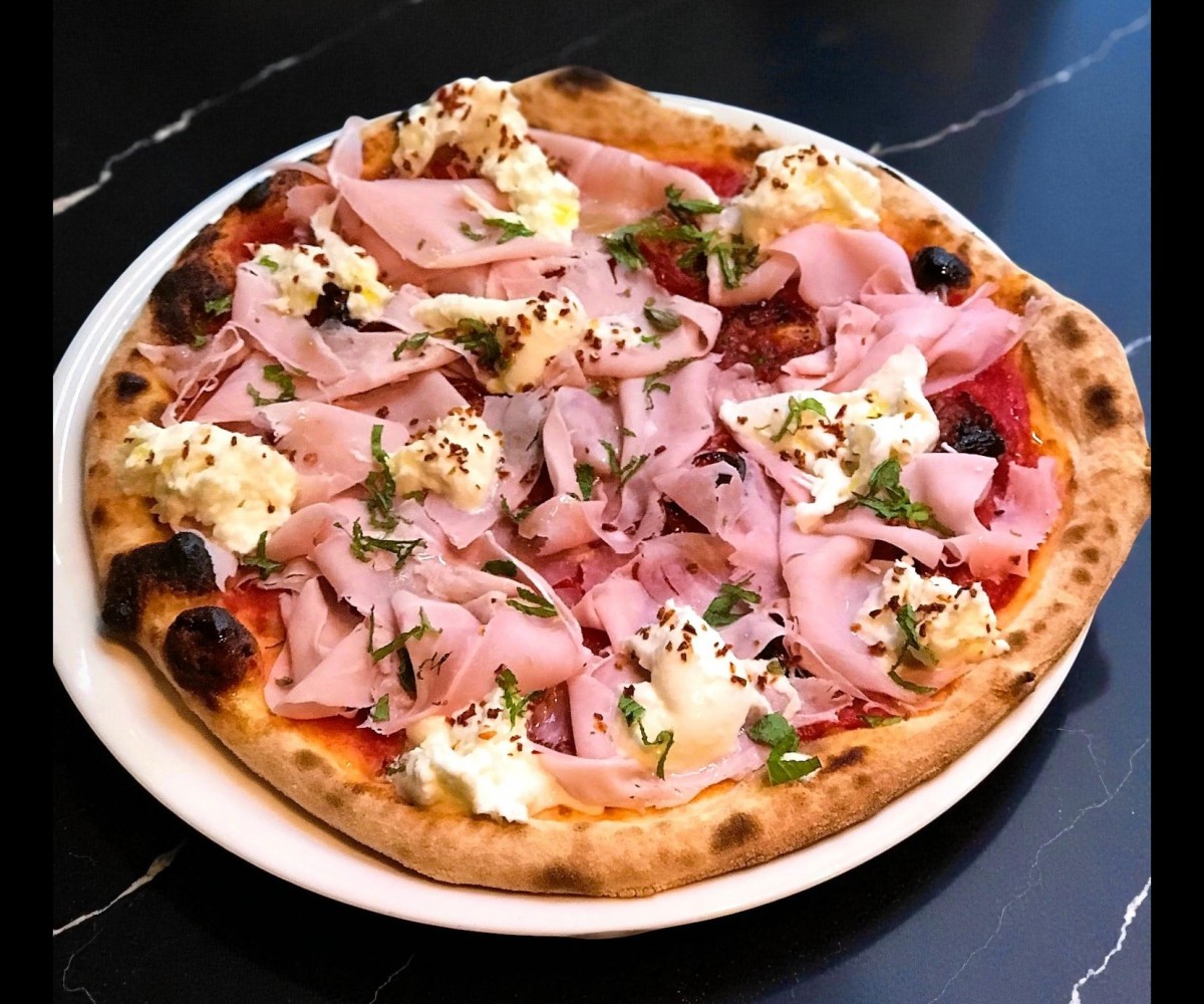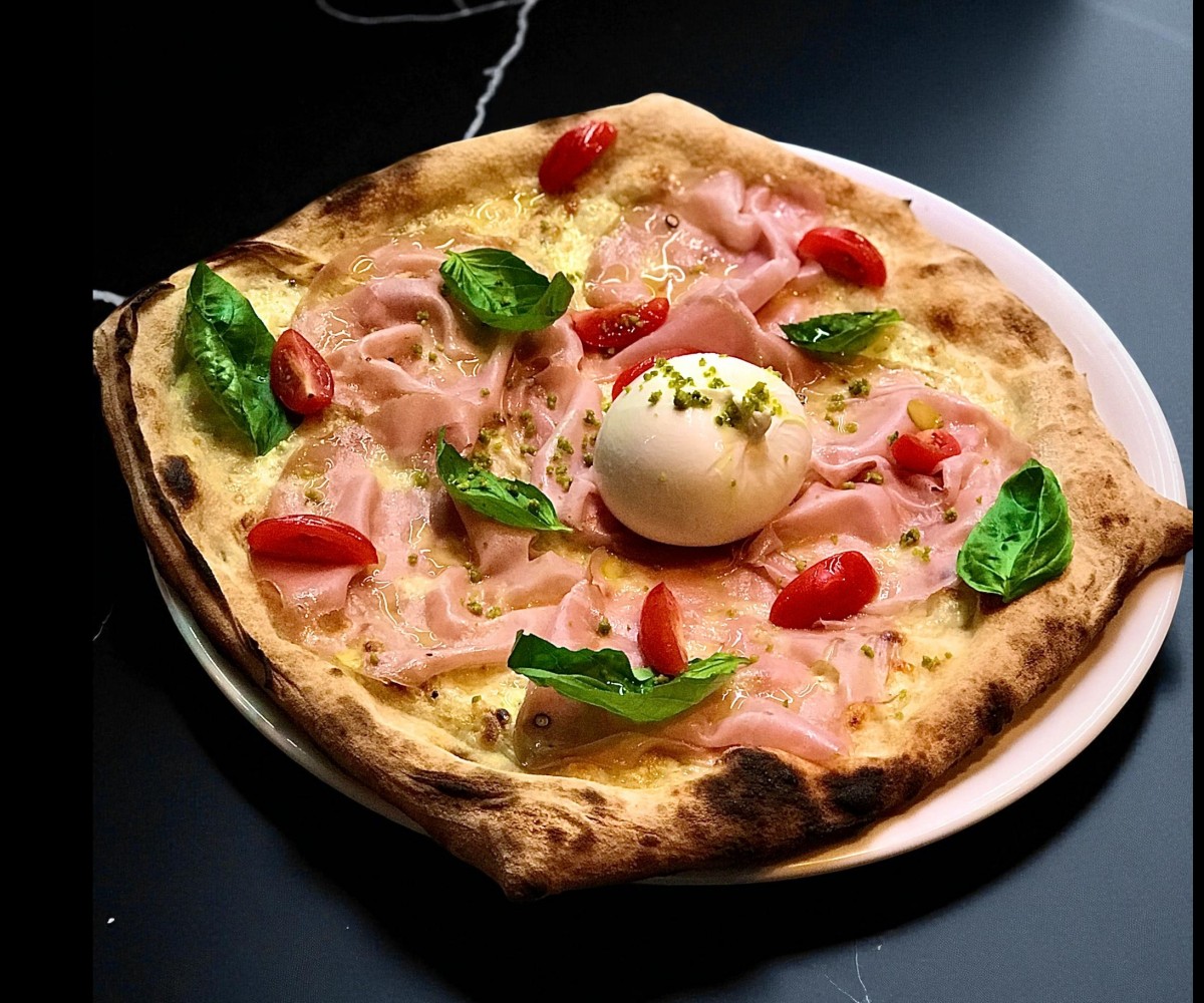 Base crème de pistaches, mozzarella fior di latte, sortie de four: mortadella à la pistache, burrata de 100gr, tomates cerise, basilic, éclats de pistaches