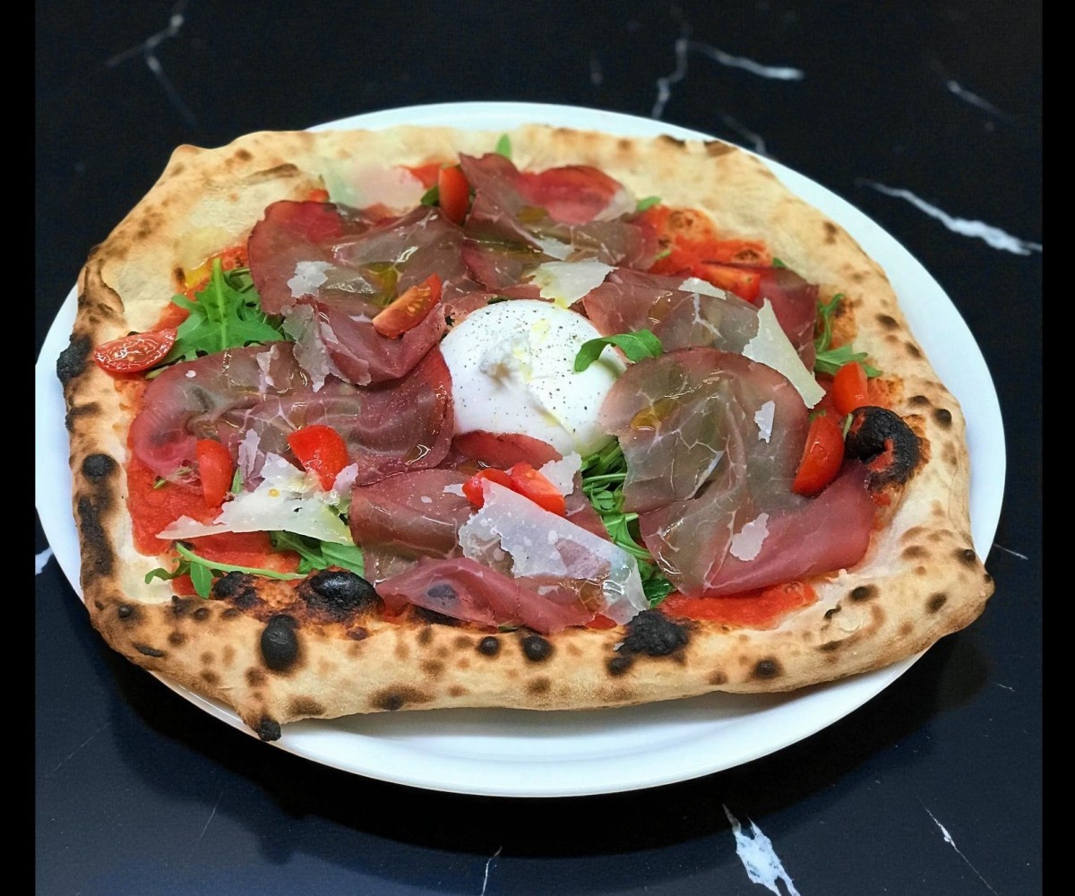 Base tomate italienne, sortie de four: roquette, burrata de 100 gr, bresaola, grana padano, tomates cerise
