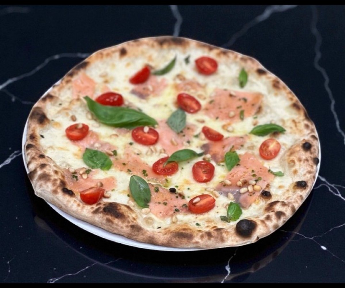 Mozzarella fior di latte, scamorzza fumée, sortie de four: saumon mariné maison à la ciboulette et huile d'olive citronée, tomates cerise, basilic, baie rose