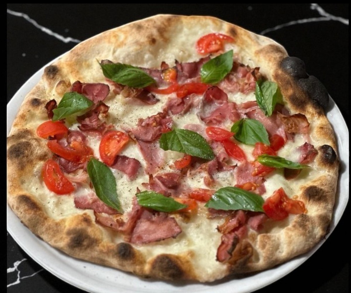 Base mozzarella di bufala dop, speck grillé, sortie de four: tomates cerise, basilic, poivre noir