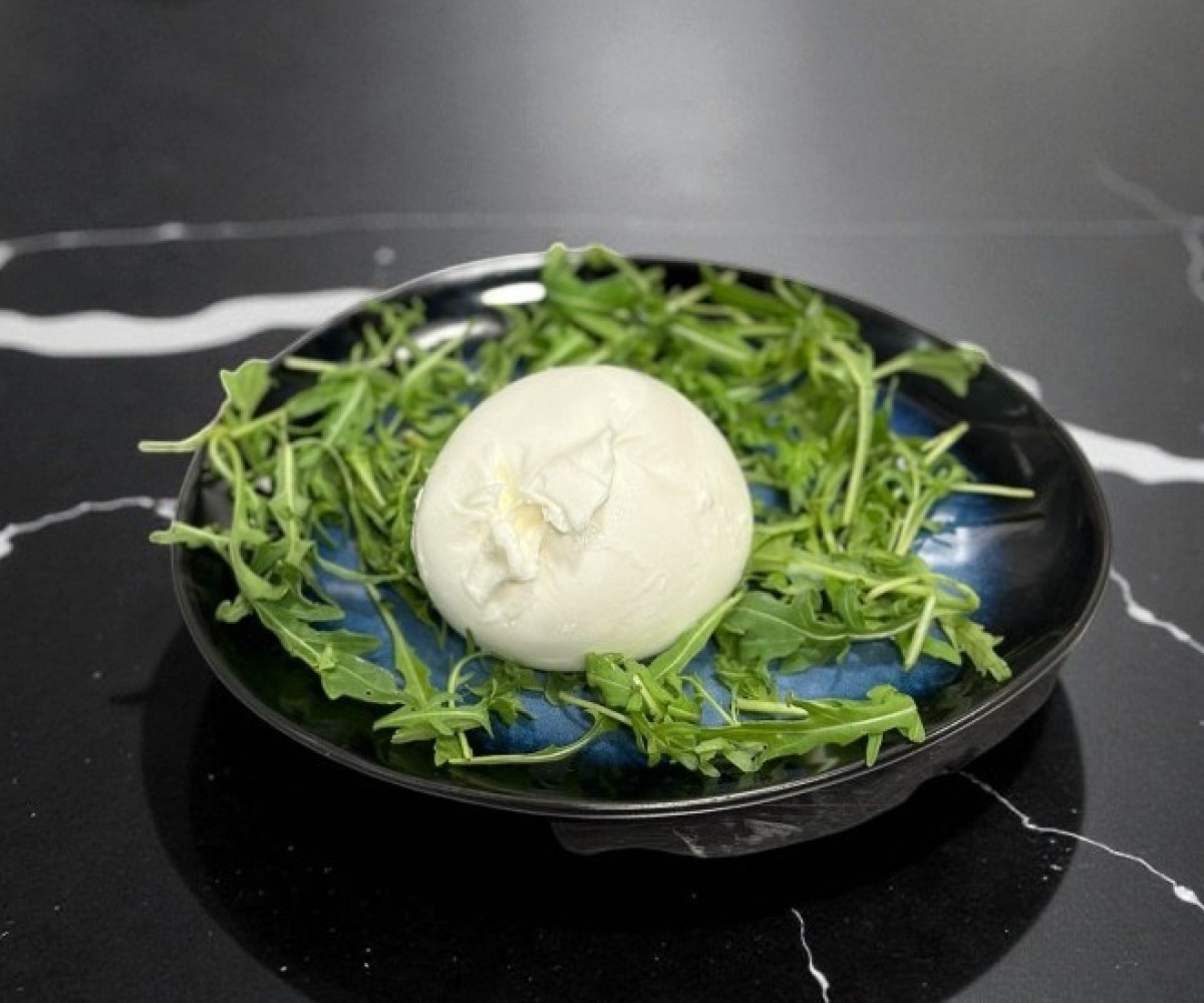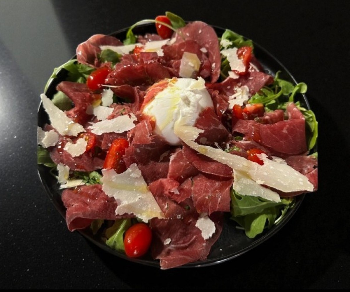 Carpaccio de Bresaola sur salade, tomates cerise, grana padano et Burratina de 100 gr