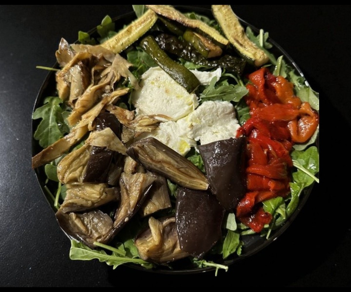 Mozzarella di bufala dop, salade, courgettes, aubergines et poivrons grillés maison, artichauts marinés