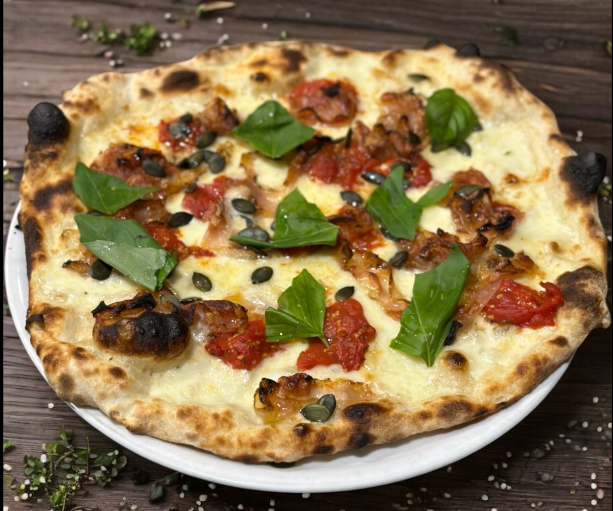 Mozzarella fior di latte, scamorzza fumée, speck grillé, tomates rôties, graines de courge, basilic, huile fumée