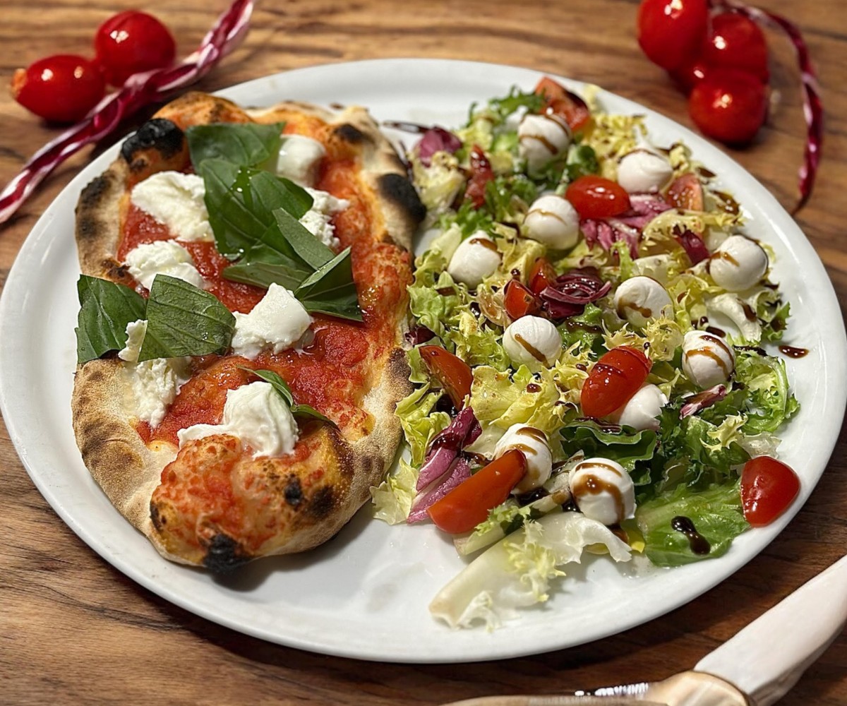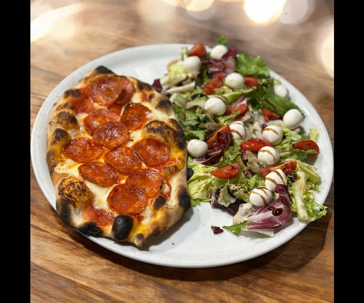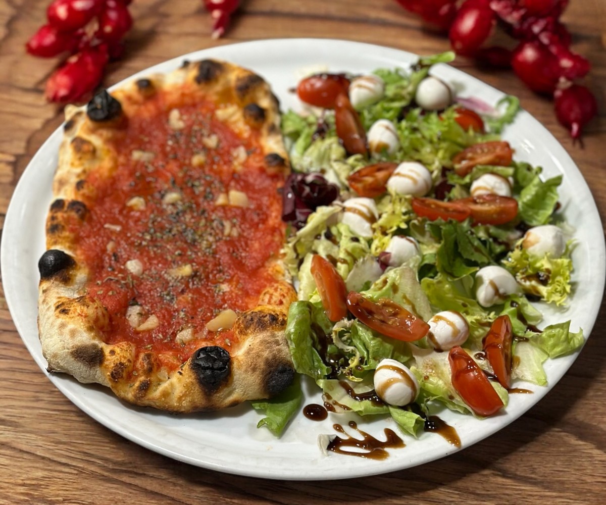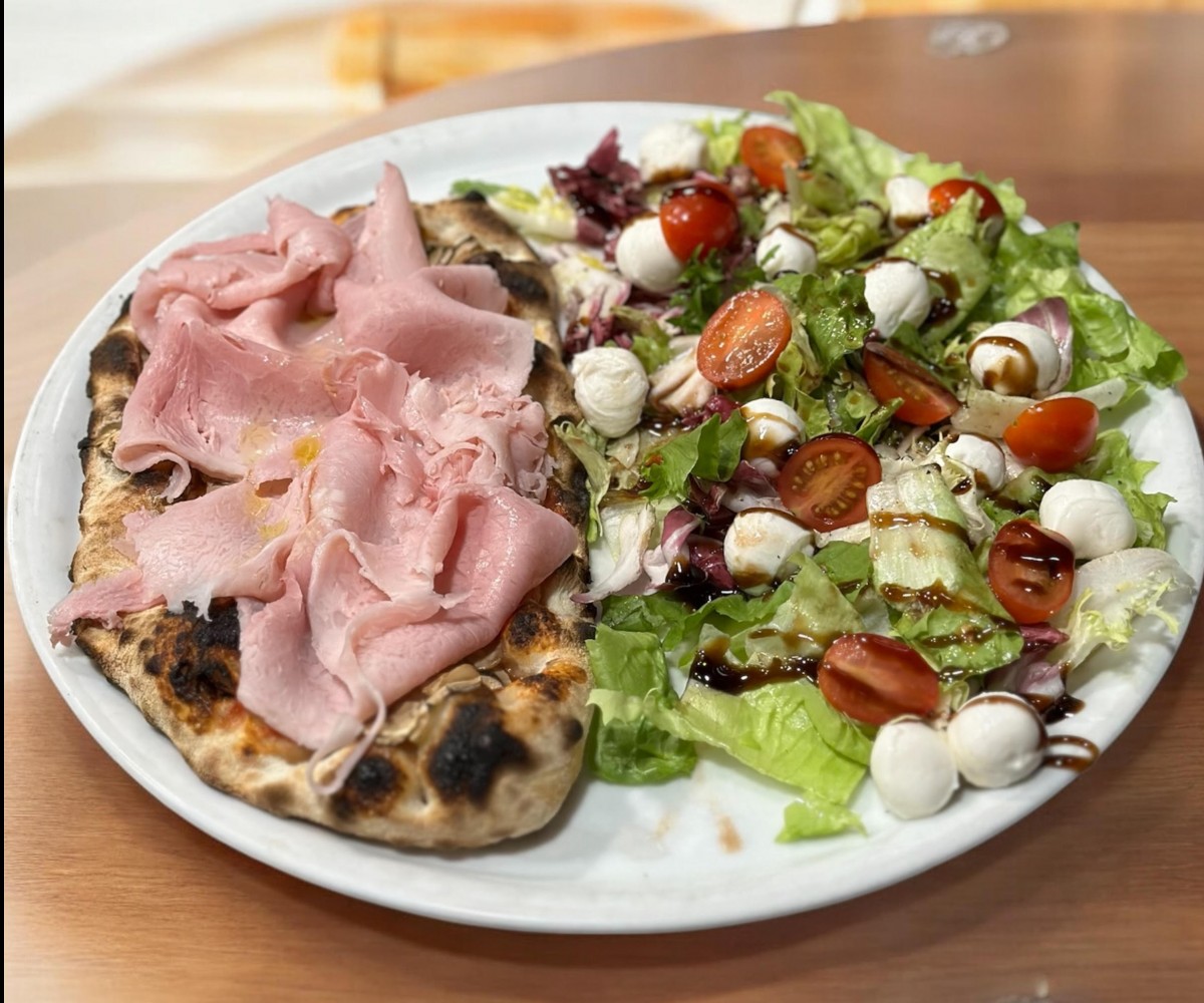 Salad, pistachio mortadella , mozzarella, cherry tomatoes, freshly ground pepperTraditional pizza