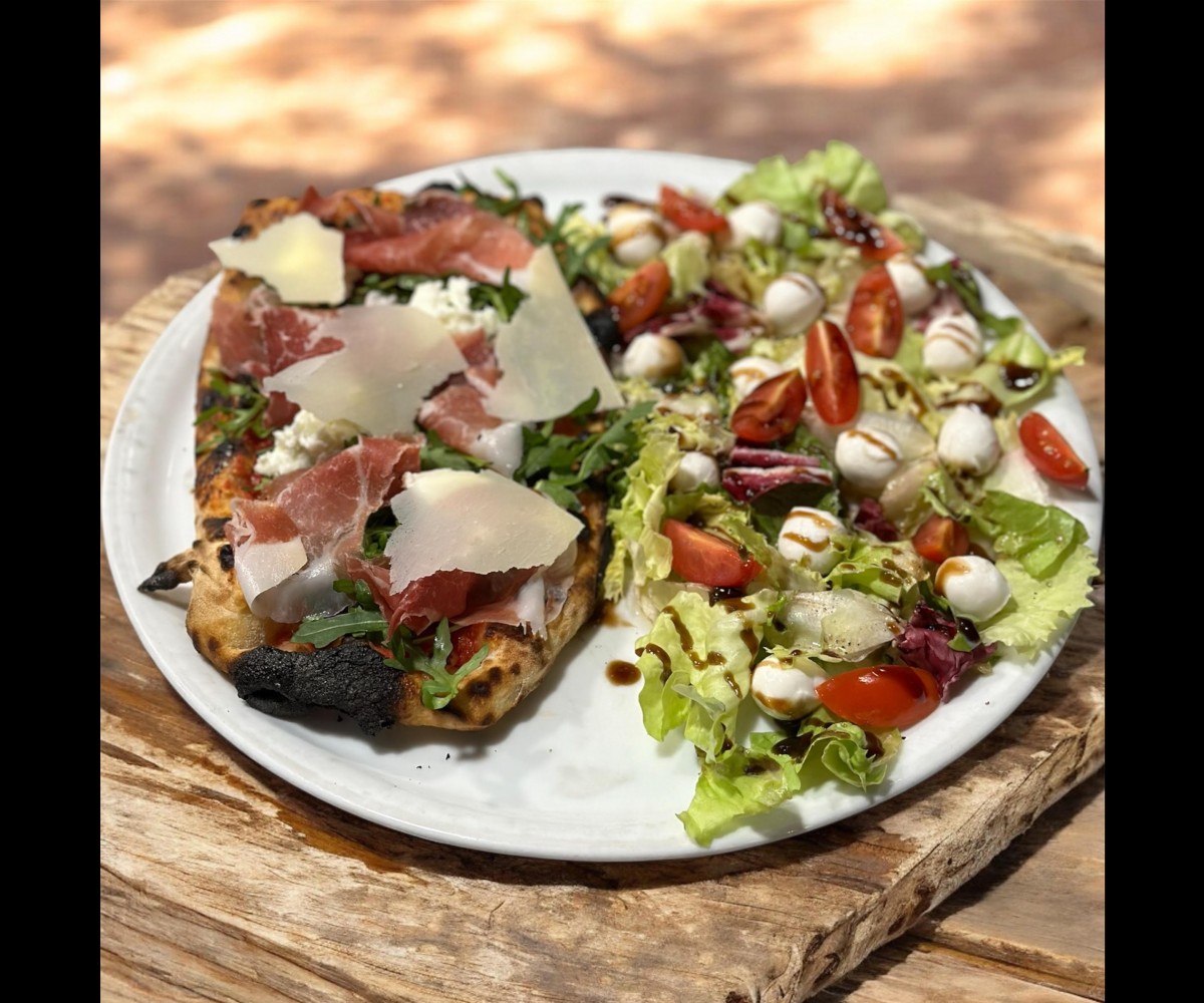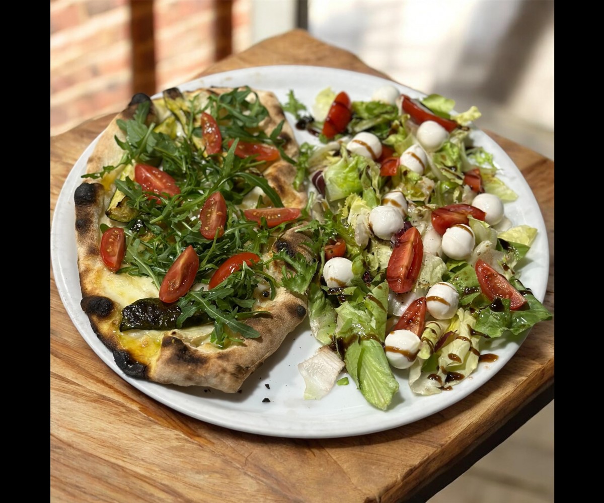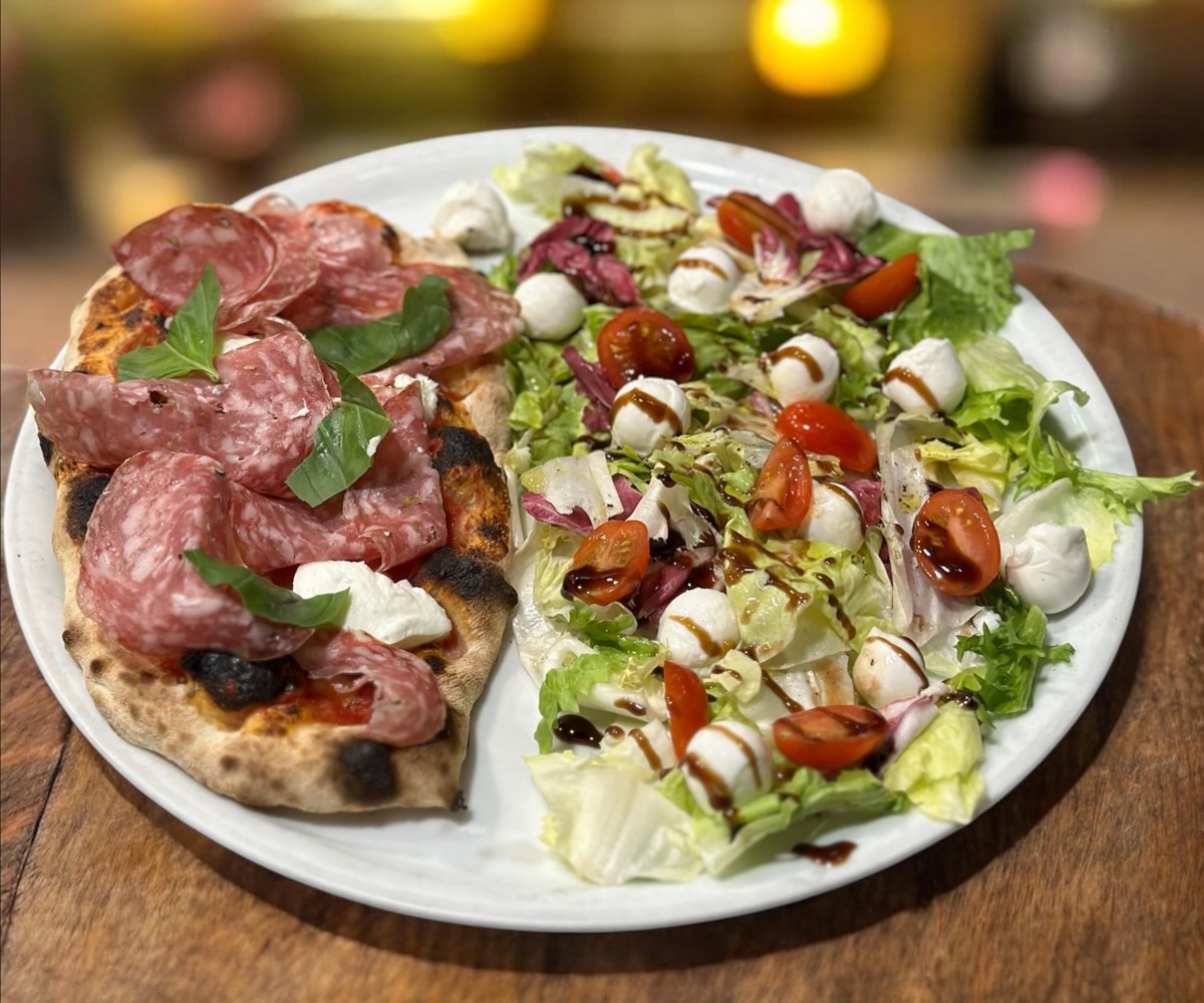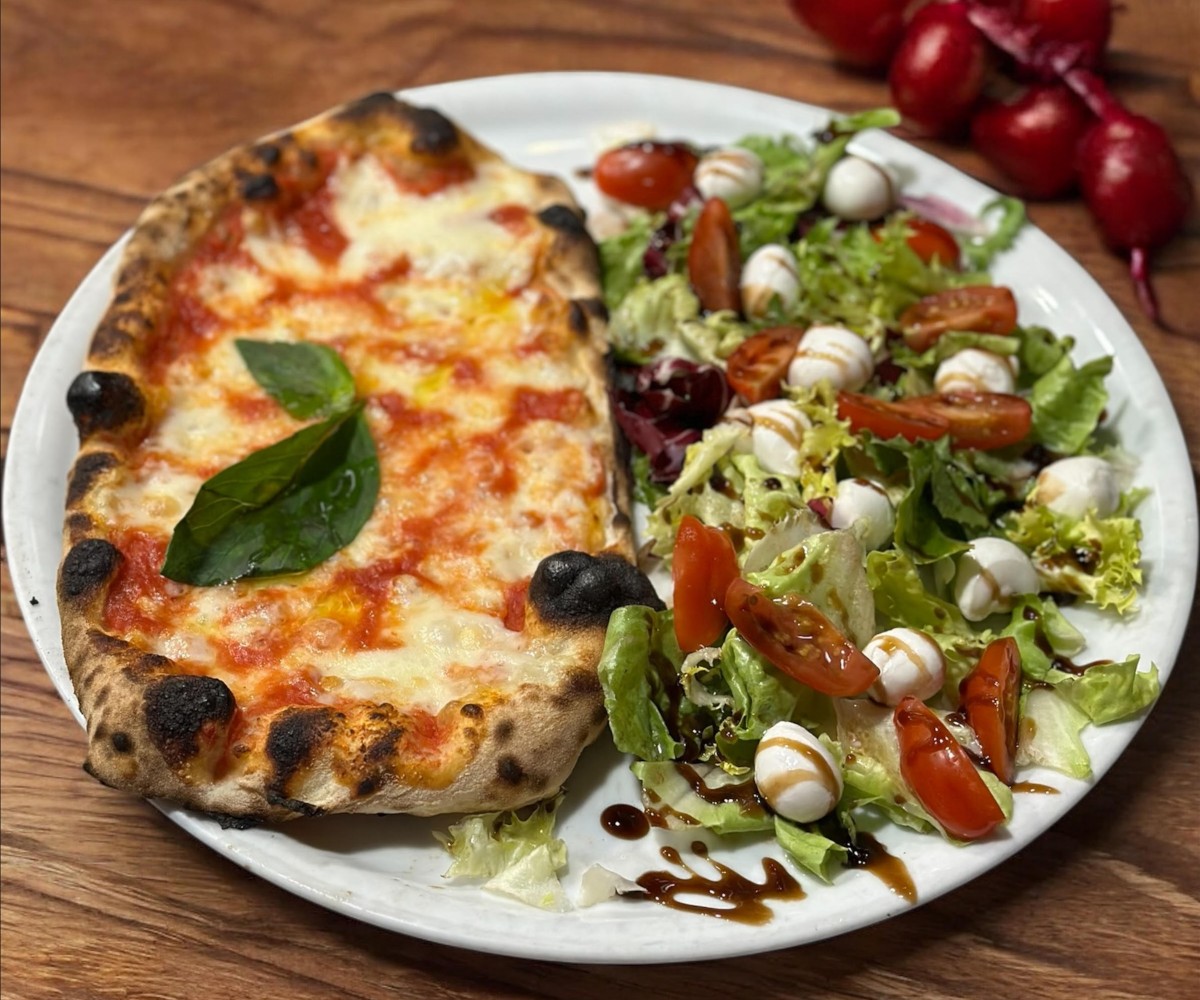 Salad, pistachio mortadella , mozzarella, cherry tomatoes, freshly ground pepperTraditional pizza
