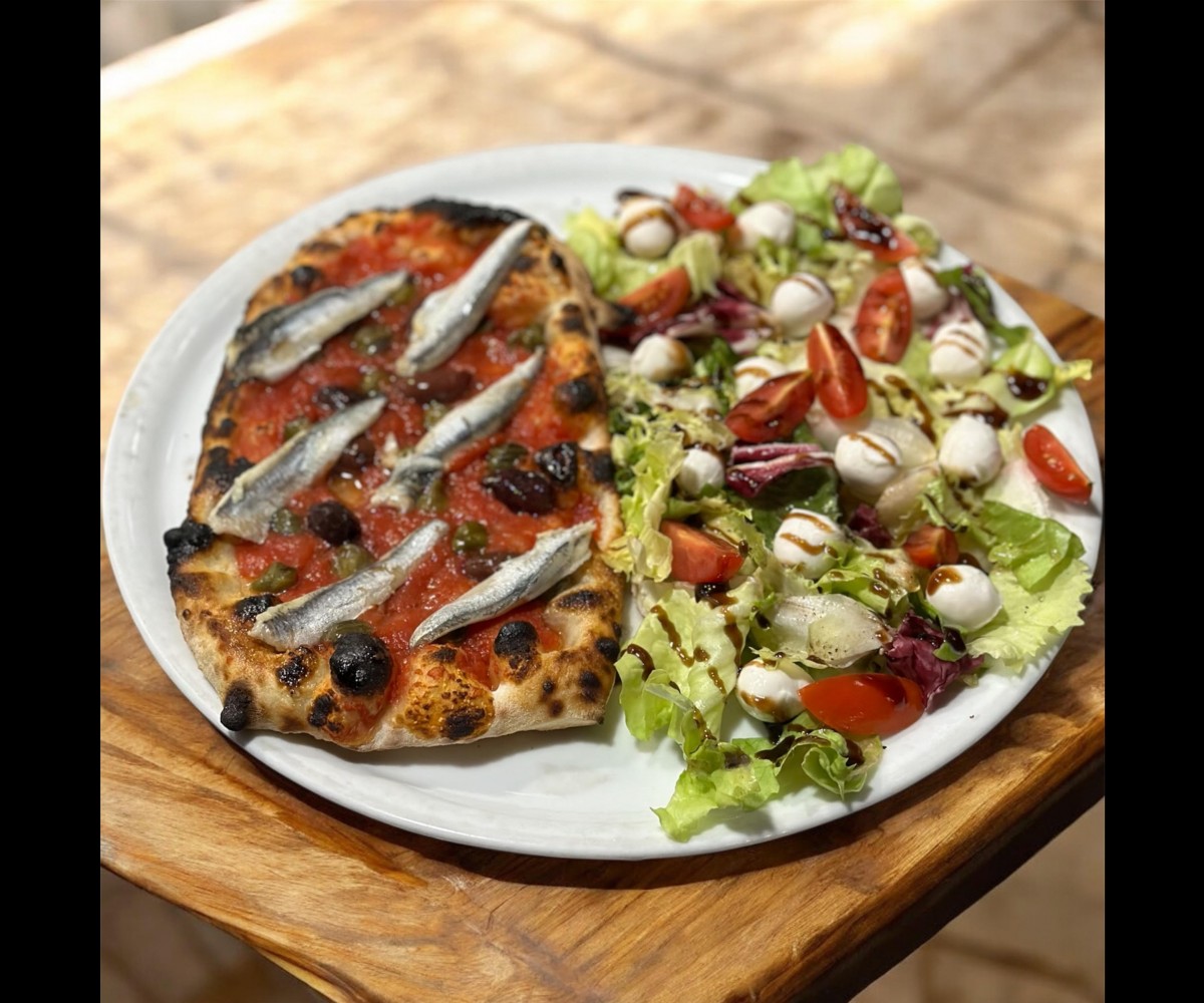 Italian tomato base, capers, black olives, fresh from the oven: unsalted anchovies