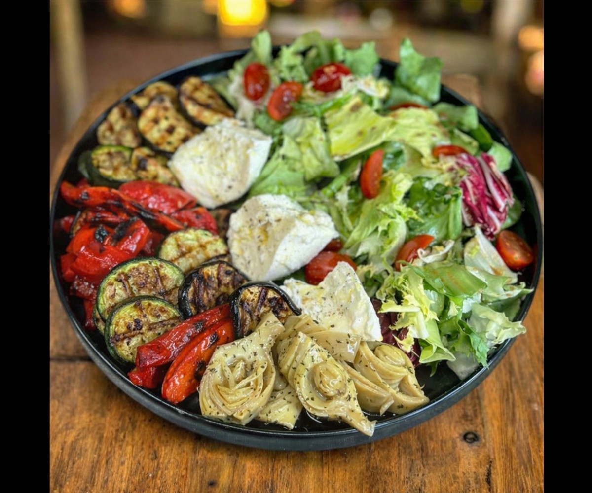 Mozzarella, salad, zucchini, eggplant and house-roasted peppers, marinated artichokes, cherry tomatoes