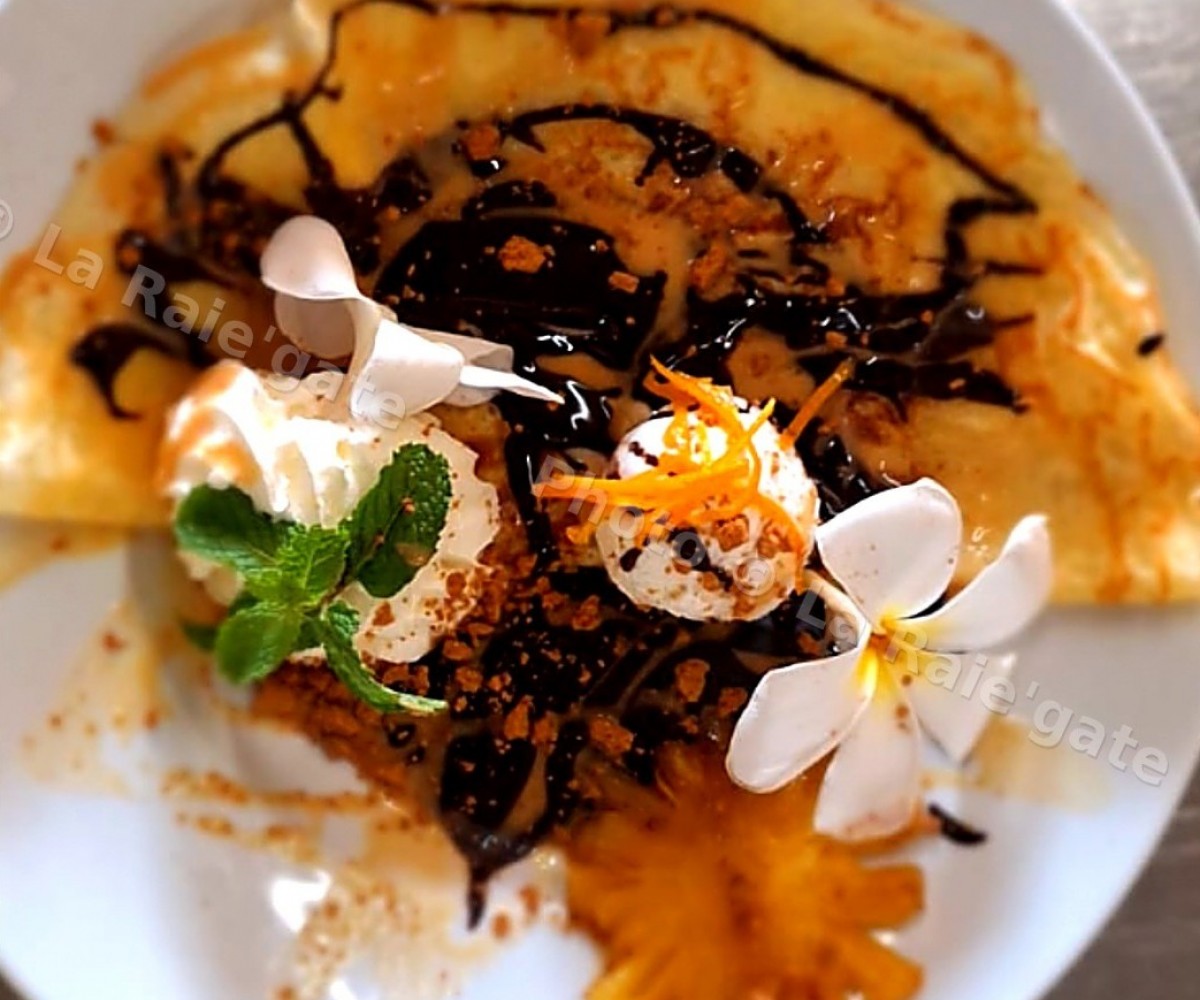 Crêpe maison glace à la vanille , coulis de chocolat chaud , caramel au beurre salé et chantilly