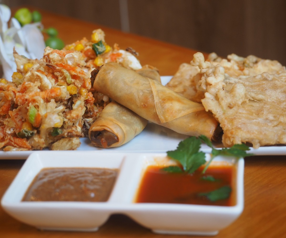 Tempura crujiente de verduras con salsa de cacahuete.Ingredientes: Zanahoria, Col, maíz, cebolla, ajo, apio, cacahuete, kaempferia galanga, hojas de kaffir lima.