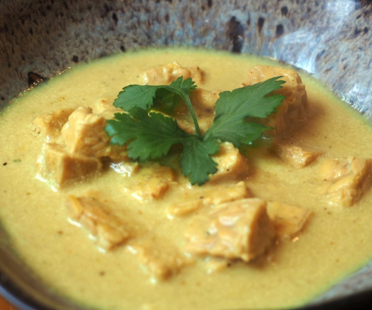Curry de tempeh.Tempeh, brotes de bambú, Cebolla, ajo, semilla de cilantro, pimienta negra, guindilla,comino, nuez moscada, jengibre, hojas de galanga, citronela, laurel.
