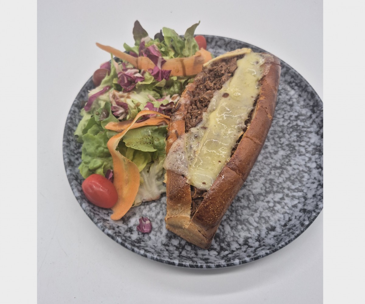 Pulled beef hot dog (180g) with homemade barbecue sauce, onion, bacon and brie