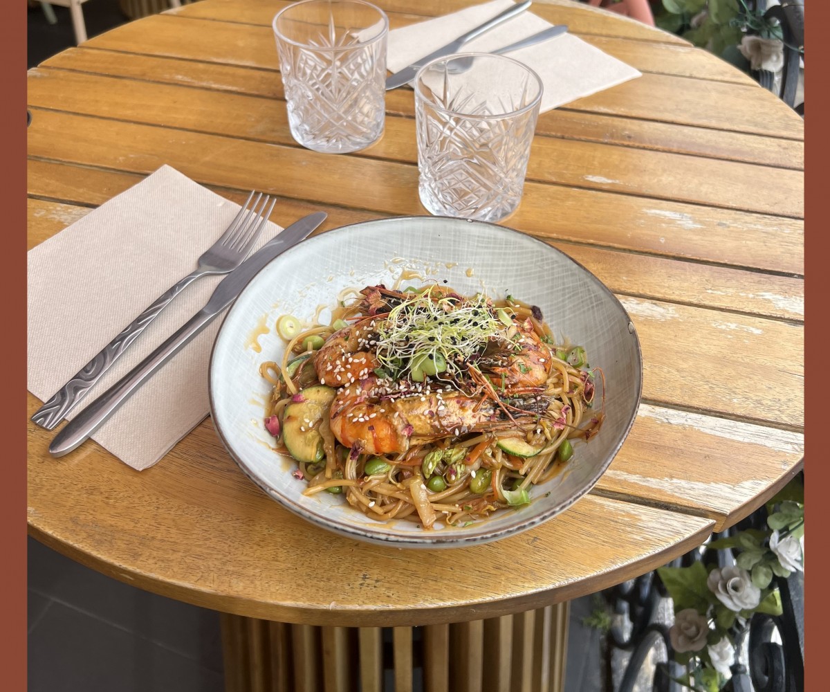 Gambas marinées, légumes en julienne, nouilles sautées, lait de coco, curry, citron vert, soja, noix de cajou.